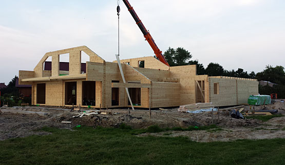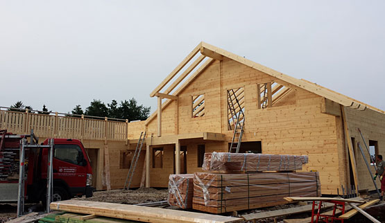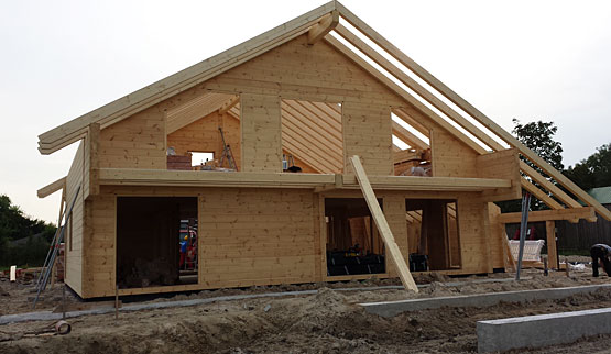 Die Bauherren bauen das Blockhaus für sich und ihre Eltern. Zwei abgeschlossene Wohnungen mit separaten Eingängen befinden sich auf zwei Etagen. Auf dem 11.000 m² großem Grundstück gibt es mehr als genug Platz für beide Generationen. Eine 100 m² umfassende Terrasse, auch zur Beobachtung der eigenen Pferde ums Haus, ist ebenfalls fest eingeplant. Die Montage der fertig gelieferten Wandelemente aus massiver Polarkiefer geht sehr schnell, insbesondere für ein Blockhaus dieser überdurchschnittlichen Größe.