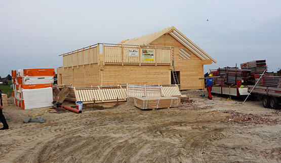 Ein großzügiges Blockhaus für zwei Parteien wird in der Wesermarsch errichtet. Wegen dem lokalen Moorboden, steht es auf einer Pfahlgründung.