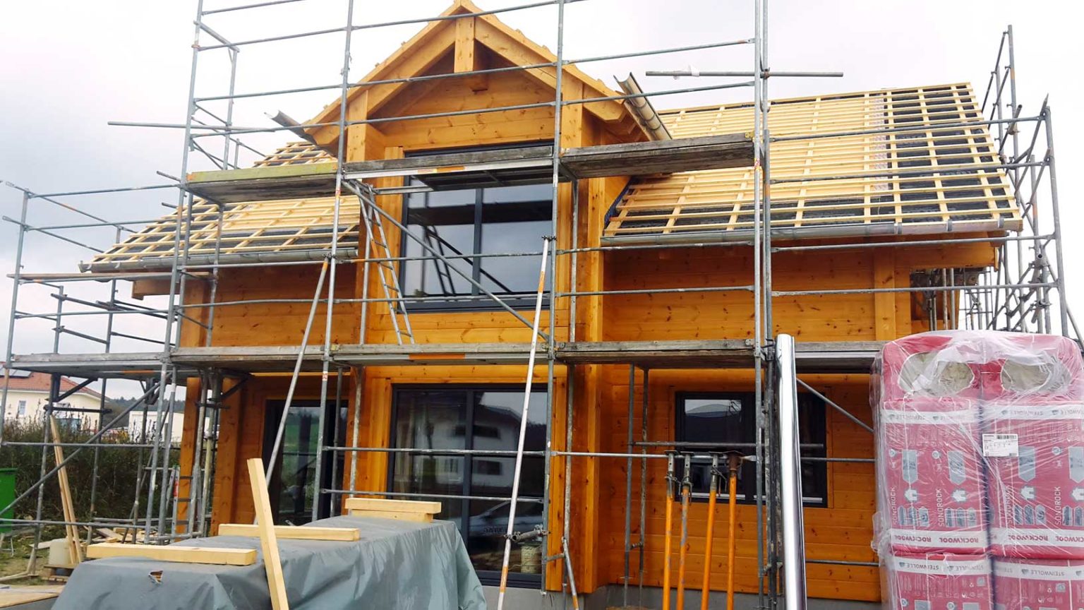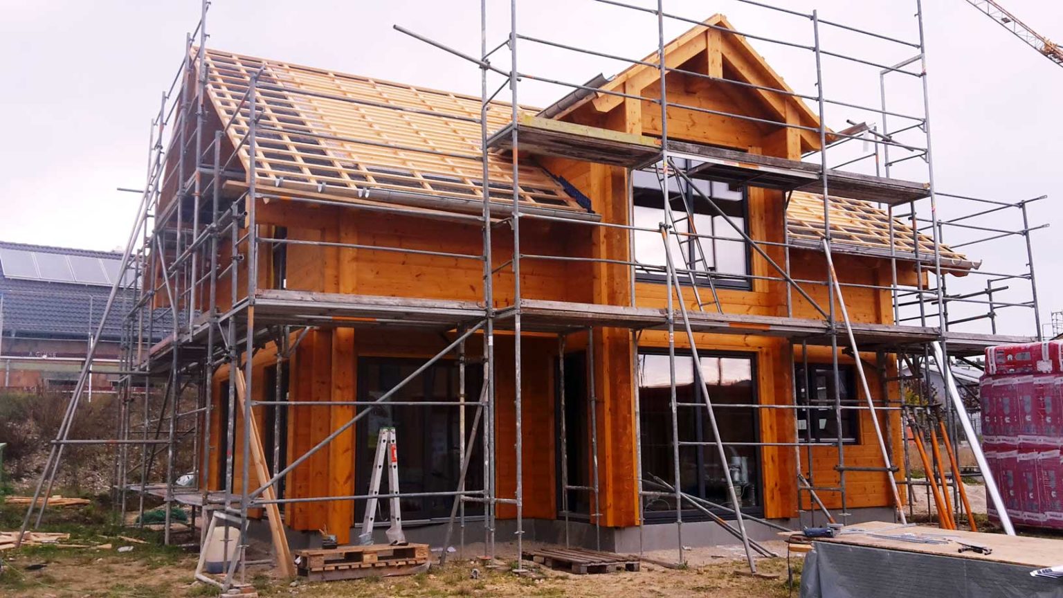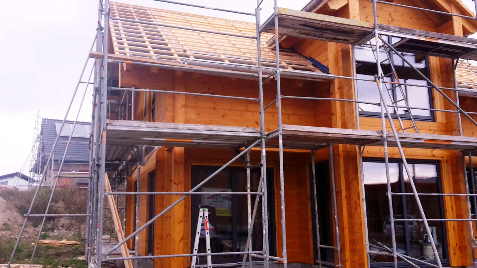 Sehr beliebt bei unseren Bauherren sind Blockhäuser mit drittem Giebel. Auch diese Bauherren planen für ihr massives Blockhaus einen "Quer-"Giebel ein und versehen diesen mit großen, bodentiefen Fenstern. So entsteht zusätzlicher Platz, besonders auch im Obergeschoss, da der dritte Giebel über zwei volle Geschosse und eigenes Satteldächlein verfügt (Zwerchhaus), und es kann reichlich natürliches Licht einfallen. Wie die allermeisten Bauherren möchten auch diese ein Blockhaus mit hellem Innenleben haben. Mittlerweile ist auch das Dach fertig gedeckt und im Hausinnern fehlt nicht mehr viel, so dass die Bauherren bald in ihr Blockhaus einziehen können.