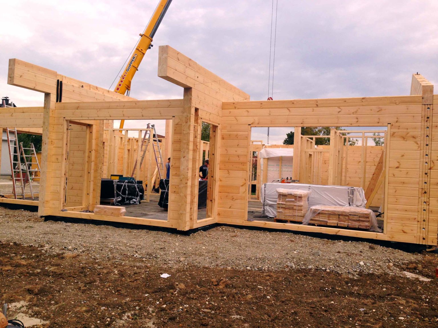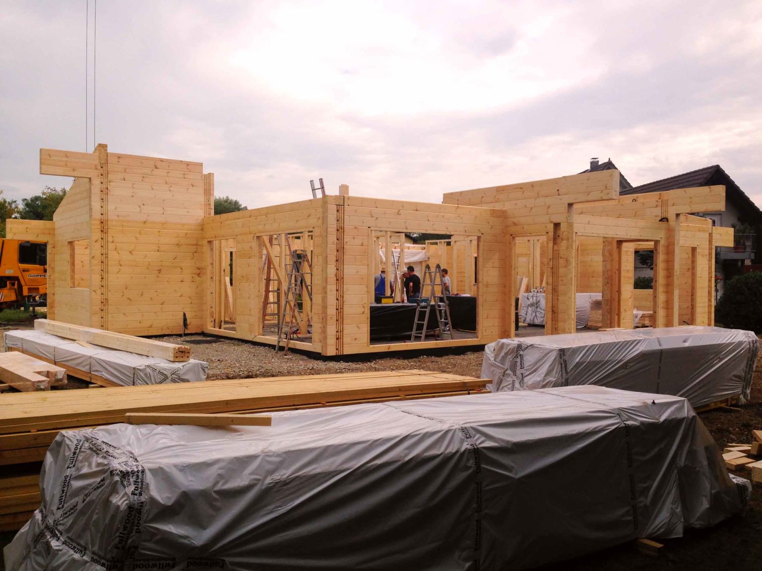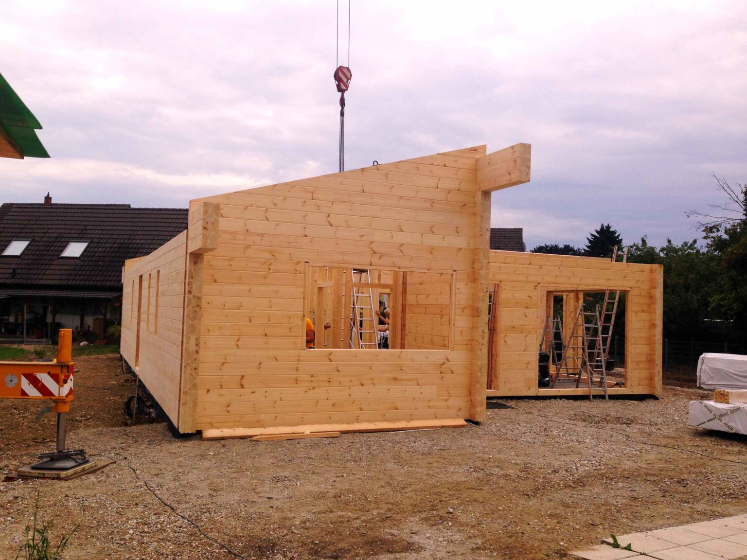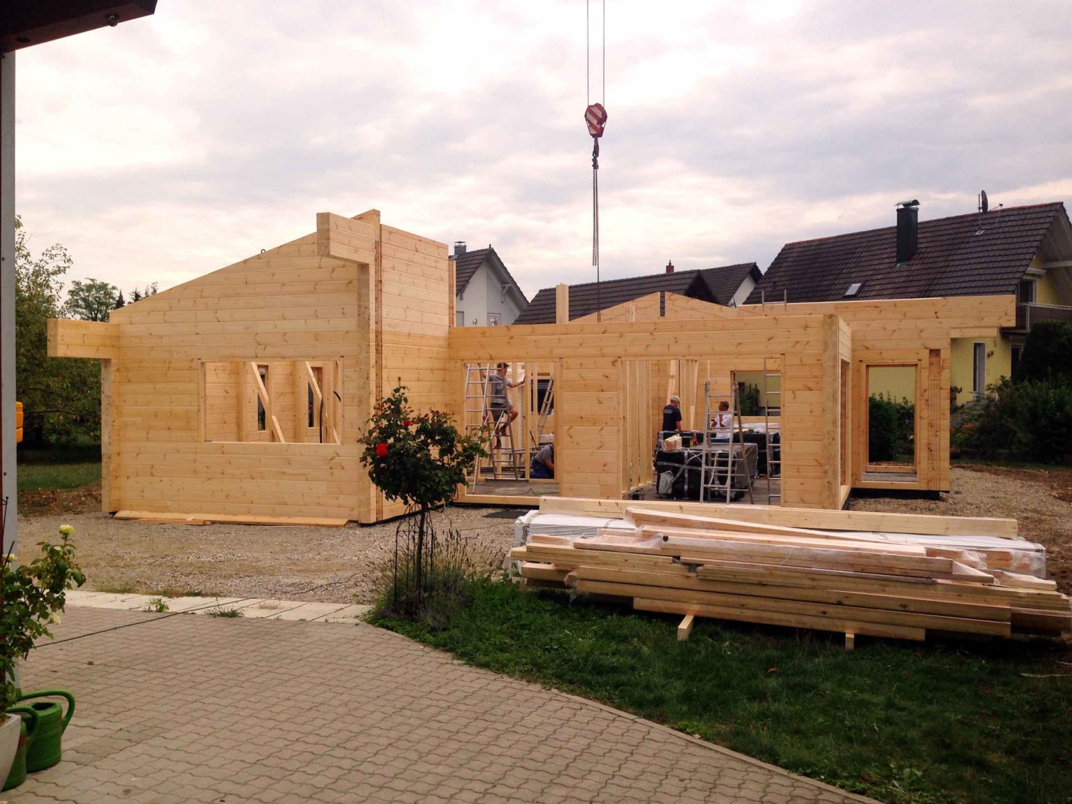 Auch dieses Blockhaus am Rhein wird, wie unsere meisten, mit der einschaligen, 20cm dicken Vollholzwand gebaut. Diese „ehrliche“ Wand braucht keine Dämmung oder besondere Behandlung: Die Bauherren sehen, was sie bekommen, ohne versteckte Inhaltsstoffe und ohne aufwändige Pflege. Da die setzungsfreien, absolut winddichten Wandelemente perfekt im Werk vorgefertigt werden, können sie am Bauplatz einfach und schnell montiert werden. Deshalb entscheiden sich viele unserer Kunden – auch diese - dafür ihr Blockhaus eigenhändig aufzubauen. Natürlich unter der Regie und Vorarbeit eines erfahrenen „Richtmeisters“ (Zimmermann), den wir stellen. Sobald die Wände montiert sind, wird der Zimmermannsdachstuhl in Handarbeit vor Ort gebaut und die Dacheindeckung vorbereitet. Türen und Fenster vervollständigen dann, neben den Dachziegeln, Das Gesicht des Blockhauses. Zuletzt kommen die Gewerke des Innenausbaus zum Zuge. Die Außenanlage entseht meist im Jahr nach dem Blockhaus-Bau.
