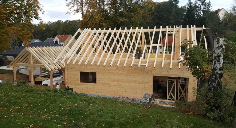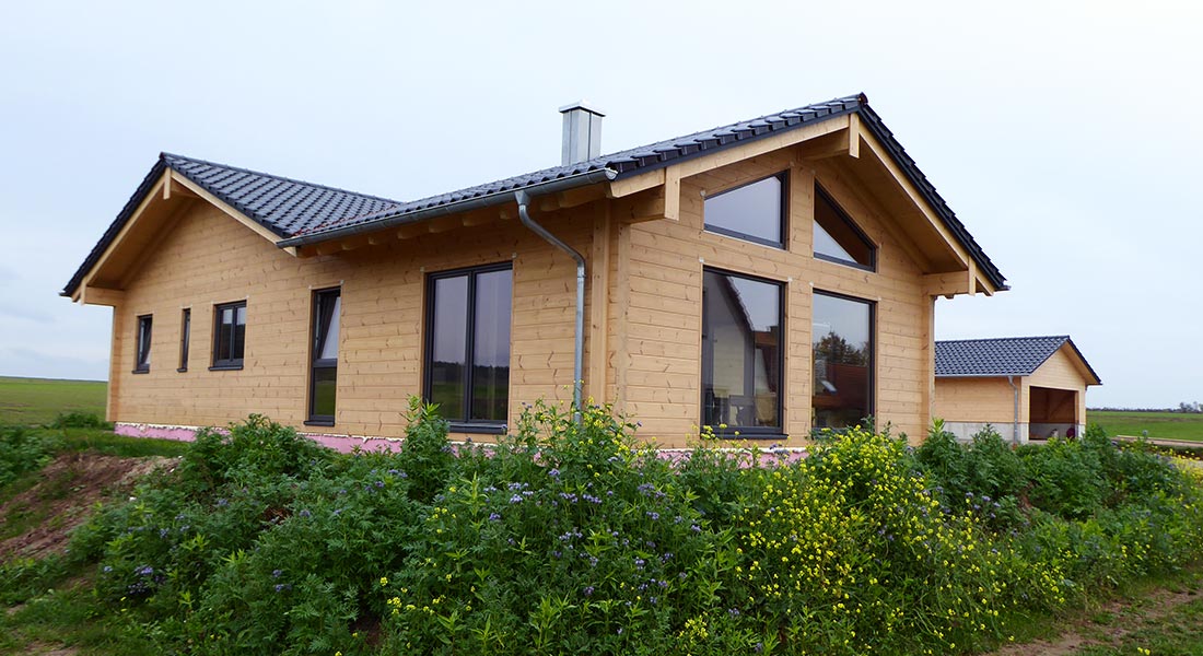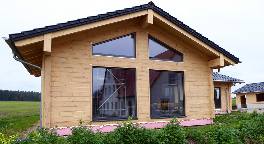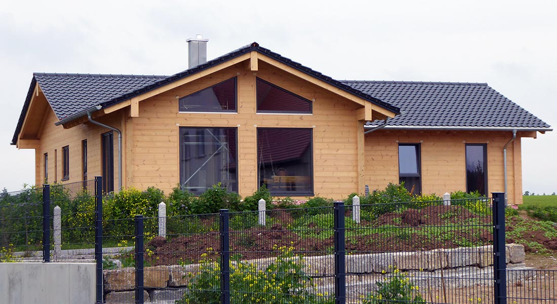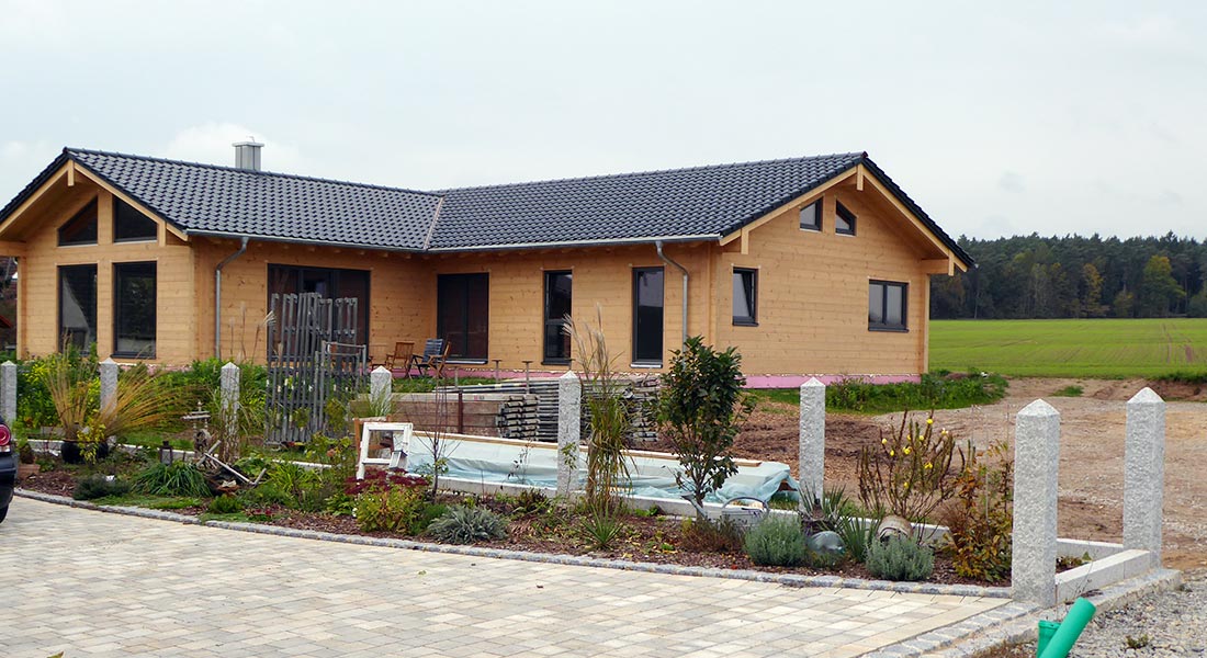 Hell und modern wollen die Bauherren ihr massives Blockhaus und wählen dafür die einschalige Blockwand von Fullwood aus. Diese ist setzungsfrei und winddicht und dämmt sehr gut. Das Blockhaus mit winkelförmigem Grundriss ist eingeschossig und besitzt drei Giebel. Derzeit erledigen ortsansässige Handwerksfirmen den Innenausbau.