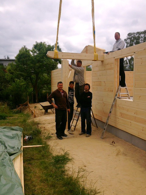Ihren lang ersehnten Traum vom eigenen Blockhaus erfüllt sich ein Ehepaar auf Usedom. Dass es unbedingt ein Winkelbungalow sein soll, steht von Anfang an für beide fest. Viele Ideen der Bauherrin fließen in die Planung mit ein, wohingegen der Bauherr mehr Input während der Realisierung gibt. Trotz komplizierter Lage des Bauplatzes, werden die im Werk vorgefertigten Wandelemente pünktlich und wohlbehalten angeliefert und abgeladen. Wie immer sind unser Richtmeister und sein Helferteam hoch motiviert bei der Arbeit. Dementsprechend sind die Vollholzwände schnell montiert und der Dachstuhl flugs gebaut. Voller Stolz betrachten die Bauherren täglich den Baufortschritt und freuen sich immer mehr auf ihr wunderschönes Blockhaus.