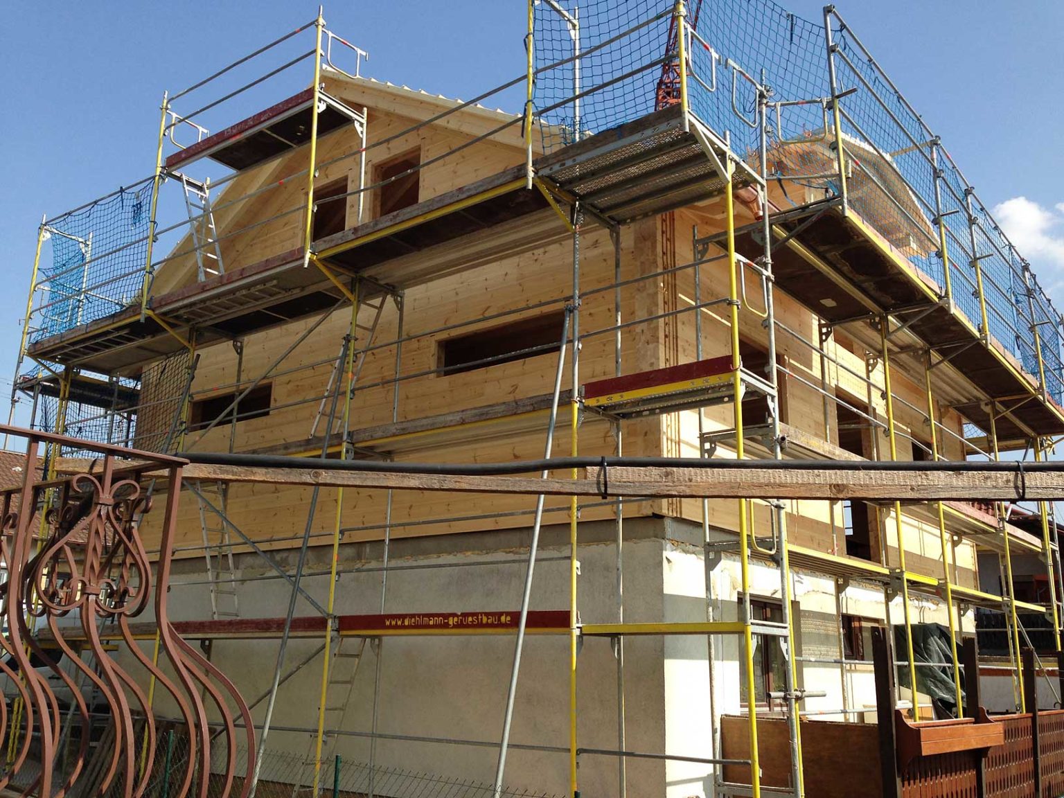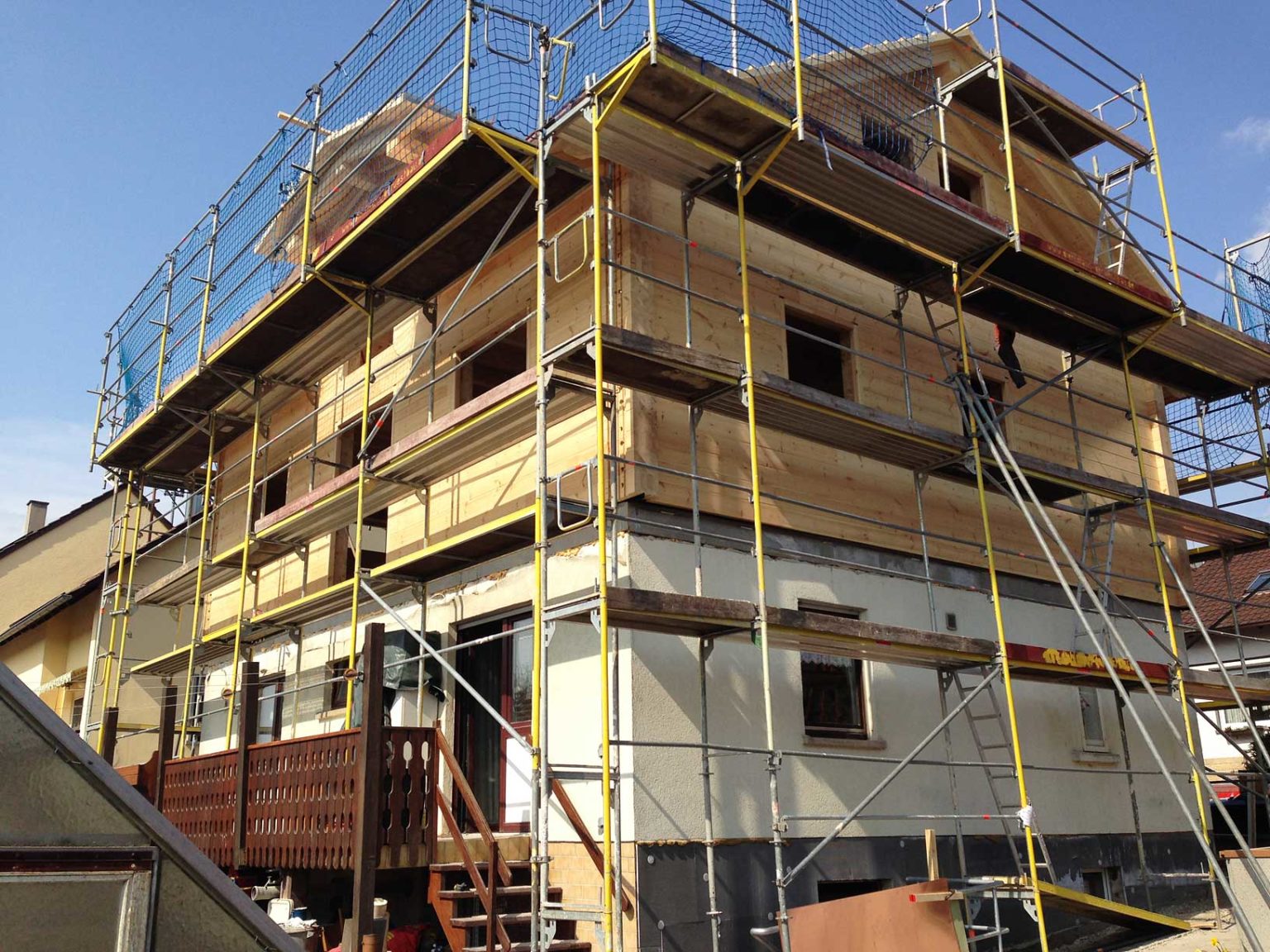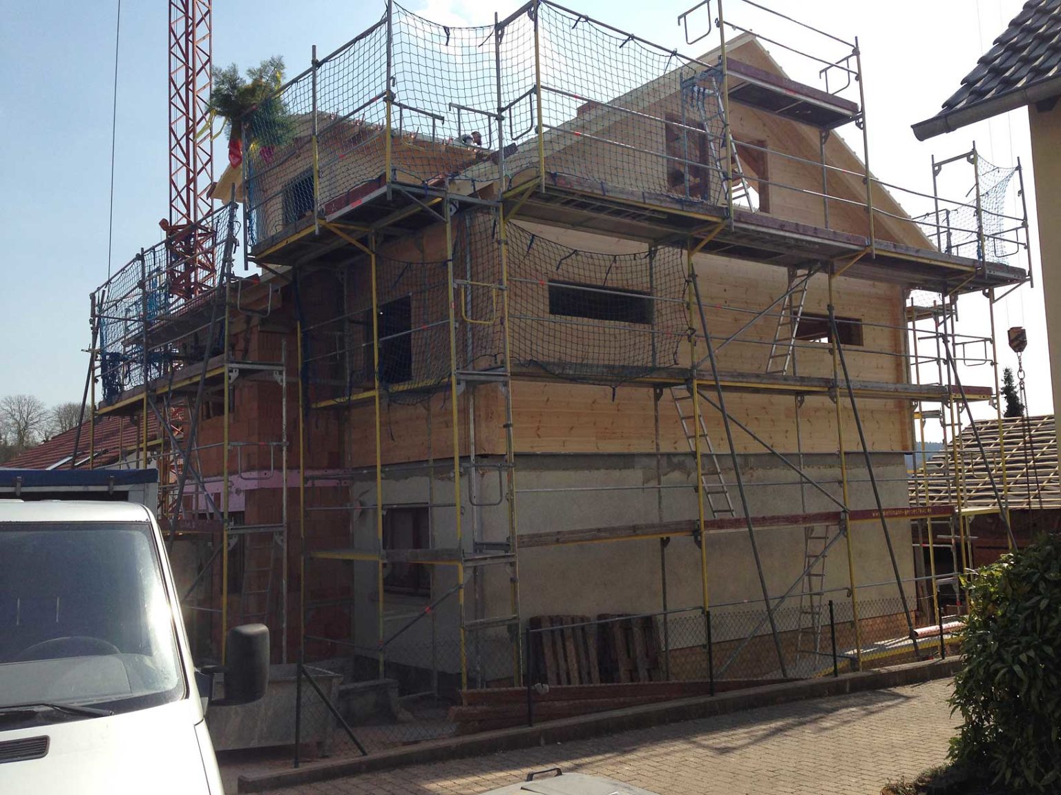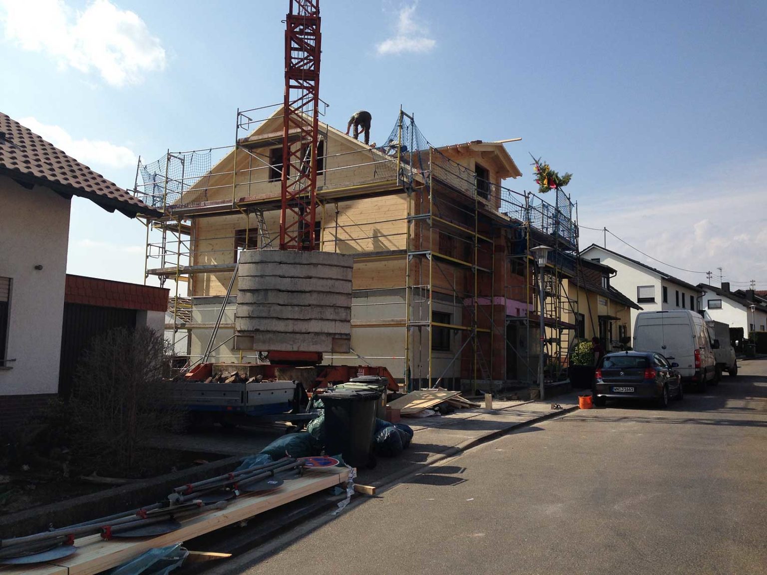 Ideen muss man haben: Die Bauherren wollen sich einerseits nicht ganz vom elterlichen Steinhaus trennen - in dem die ältere Generation weiterhin wohnt - aber andererseits den Traum vom Blockhaus verwirklichen. Also lässt man das Obergeschoss und das Dachgeschoss des Steinhauses abtragen und baut auf das verbleibende Erdgeschoss ein massives Blockhaus. Auch das ursprüngliche Treppenhaus bleibt bis ins Obergeschoss erhalten. Dank der setzungsfreien Fertigwände von Fullwood ist diese Kombination bedenken- und problemlos möglich. Selbstverständlich ist das Bauvorhaben zuvor zusammen mit Fullwood bis ins kleinste Detail durchdacht und geplant worden. Nun stecken die Bauherren viel Eigenleistung in Abbruch und Neumontage.