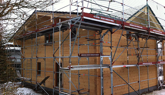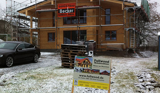 Durch den hohen Kniestock gewinnen die Bauherren im Dachgeschoss sehr viel Platz zum Wohnen und Möbelstellen. Noch mehr Wohnfläche erhält das große Blockhaus durch den dritten, vortretenden Quergiebel, der den quadratischen Grundriss des Hauses bereichert. Auf der Baustelle kann bei jedem Wetter am und im Blockhaus gearbeitet werden. Anstatt sich nun endlich vom heutzutage gängigen Weihnachtsstress zu erholen, arbeiten die Bauherren lieber die Kalorien von Gänsebraten, Weihnachtsplätzchen und Co. an ihrem Blockhaus ab. Ziel der Bauherren und involvierten Handwerker ist ein schnellstmöglicher Einzug ins Blockhaus - bei Häusern von Fullwood ist das in der Regel sowieso üblich.