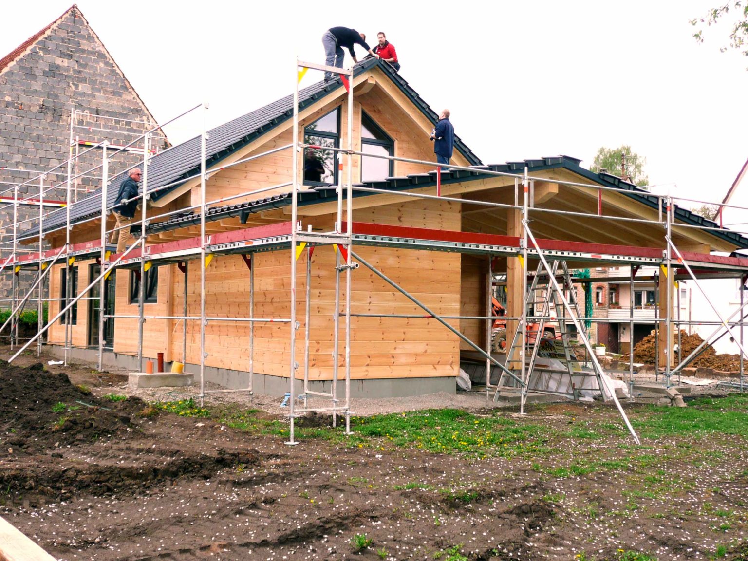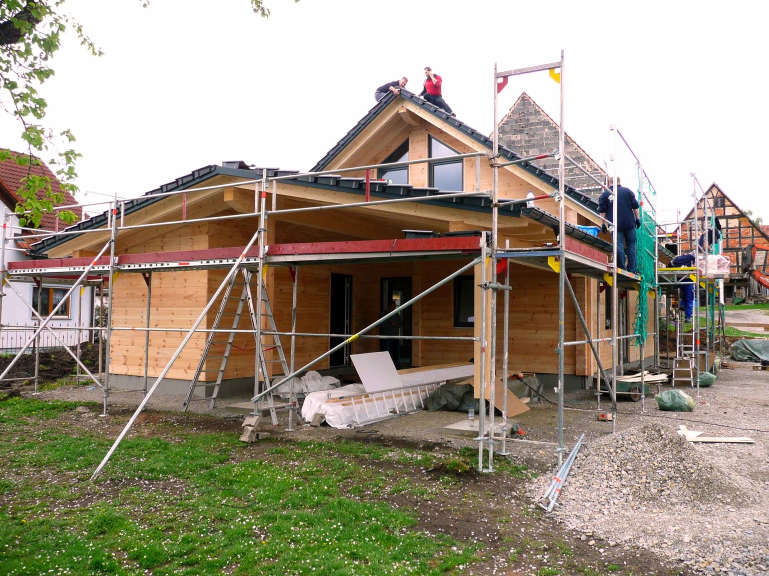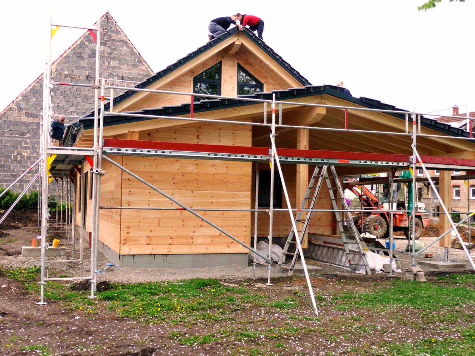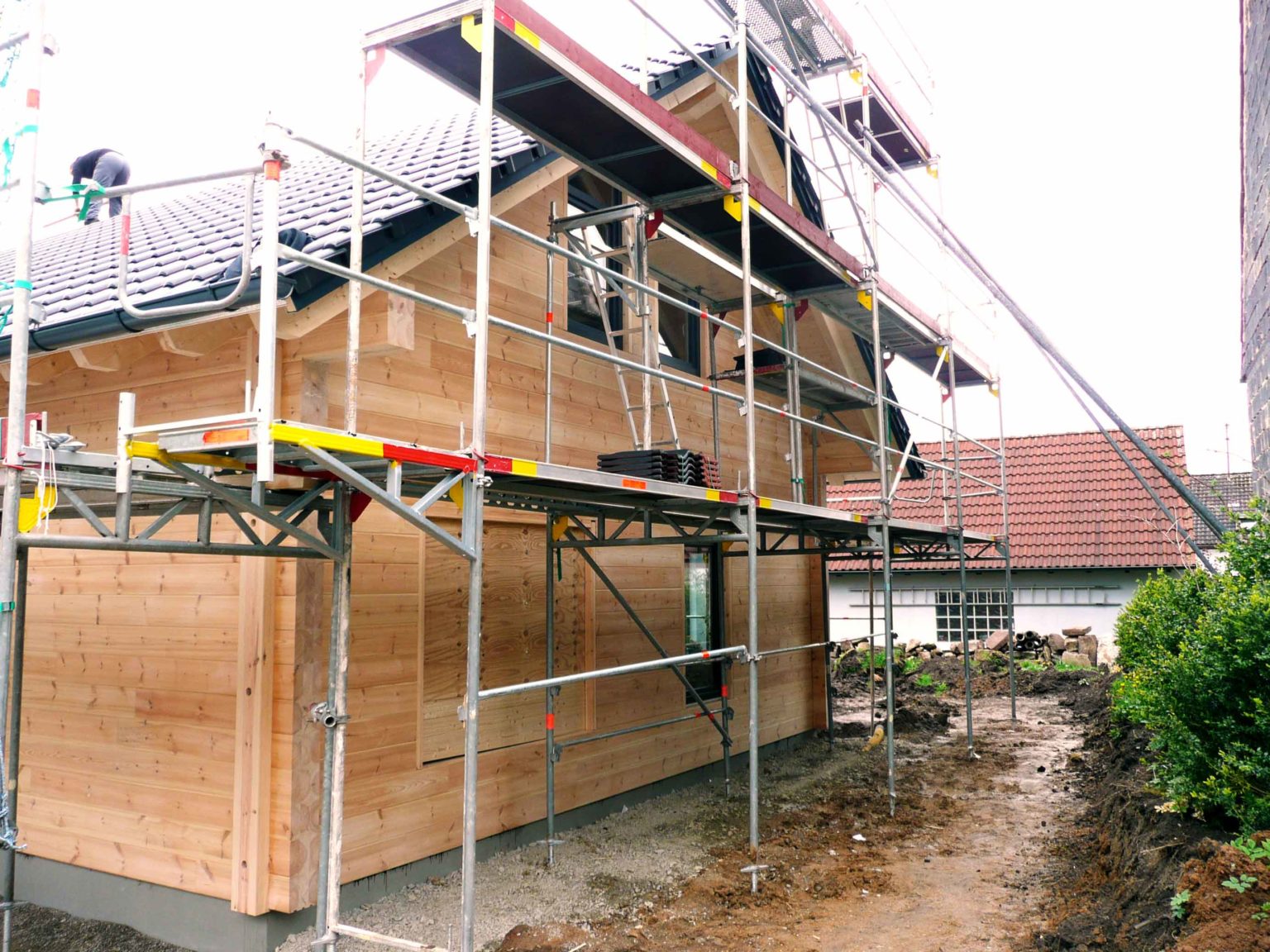 Von Tag zu Tag wächst und gedeiht das neue Blockhaus, sehr zum Wohlgefallen der Bauherren und Nachbarn. So zügig wie hier der Hausaufbau gelingt, geht derzeit auch der Innenausbau voran. Wenn weiterhin alles so perfekt nach Plan läuft, kann der anvisierte Einzugstermin sogar unterboten werden. Selbstverständlich leidet die Qualität des Blockhauses nicht unter der Schnelligkeit seines Auf- und Ausbaus. Die einzelnen Wandelemente werden vor der Montage am Bauort penibel geplant und konstruiert, und danach passgenau im Werk vorgefertigt. Die Langjährige Erfahrung von Fullwood Wohnblockhaus zahlt sich immer wieder aus.
