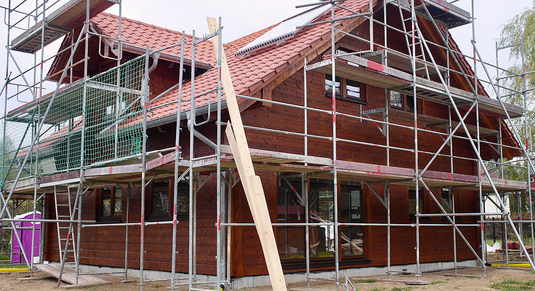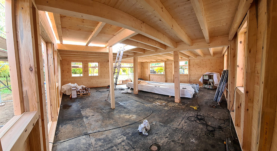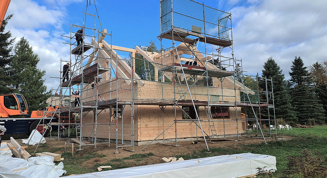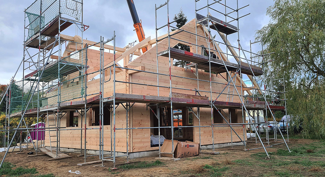 Bei diesem Blockhaus in nachhaltiger Bauweise spielt ökologisches Bauen eine übergeordnete Rolle. Der Bauherr, ein Musiklehrer, und seine Frau verwenden im Innenausbau Lehmputz, der den Feuchte-Ausgleich in sehr trockenen Wintern oder Sommern natürlich vereinfacht. Bei dem Blockhaus Bau setzt das Paar viel Eigenleistung für ihr neues Eigenheim auf und verwendet neben der einschaligen Blockwand hauptsächlich die Fullwood-Kombiblockwände.