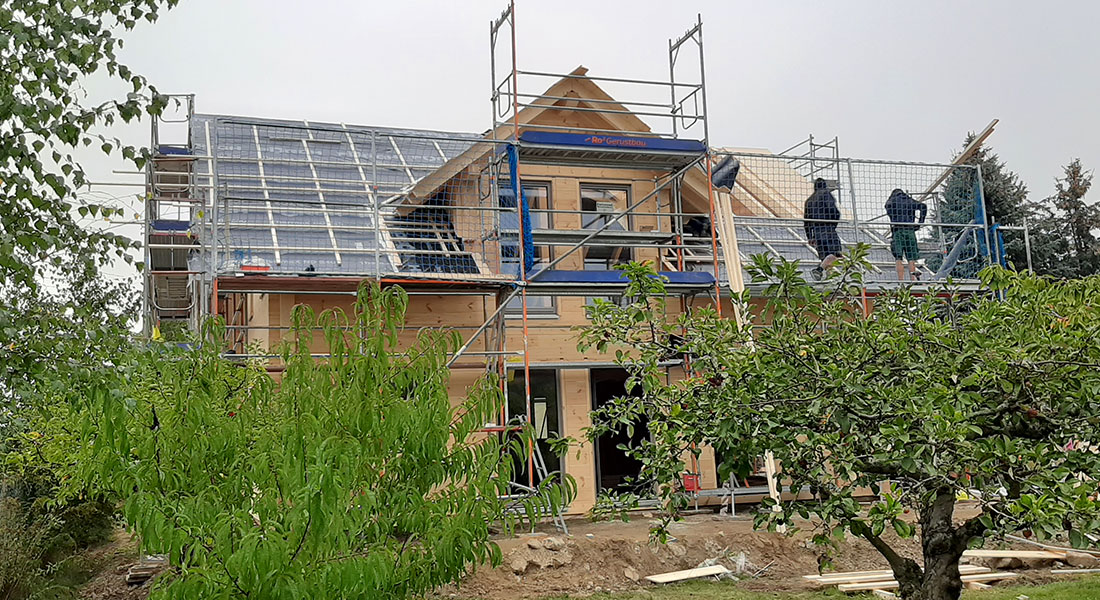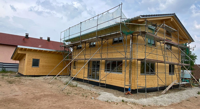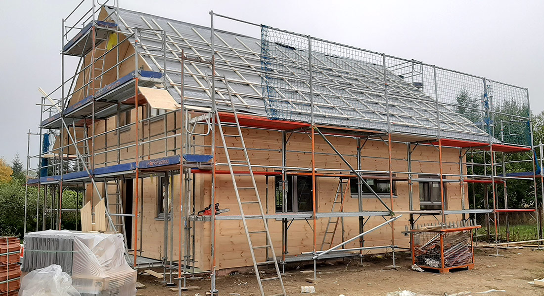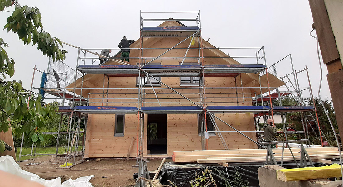 Hier realisiert ein selbstständiger Landschaftsbauer seinen Traum vom Blockhaus. In wenigen Tagen werden die massiven Blockwände sorgfältig auf dem Bauplatz montiert. Bestehender Baumbestand auf dem Grundstück kann erhalten bleiben. Modern und geradlinig möchte der Bauherr sein Blockhaus und genau so plant und baut Fullwood Wohnblockhaus es dann auch.