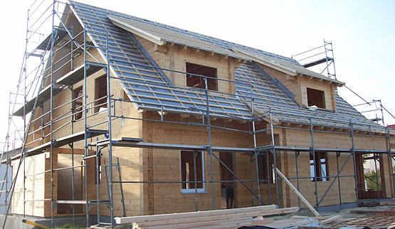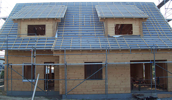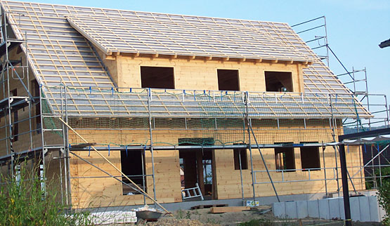 Gleich drei Gauben weist dieses neue Blockhaus auf, das erweitert das Platzangebot im Dachgeschoss enorm. Bei vier Kindern muss alles noch genauer durchdacht und besonders praktisch geplant werden, damit der Familienalltag später reibungslos funktioniert. Um die Baukosten so gering wie möglich zu halten, entscheiden sich die Bauherren für eine Richtmeistermontage mit viel Eigenleistung, besonders im Innenausbau. Die Eltern und Schwiegereltern der Bauherren helfen das Blockhaus zu montieren und auszubauen. Auf Qualität will man zu Gunsten des Bau-Etats aber nicht verzichten und entscheidet sich deshalb für ein echtes Blockhaus von Fullwood.