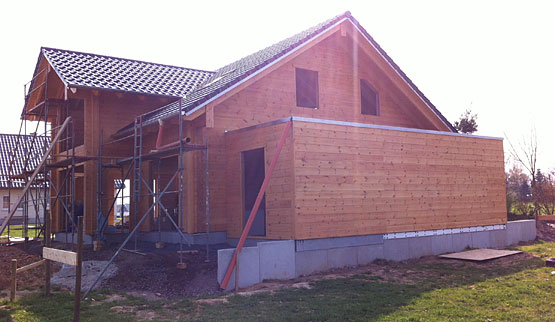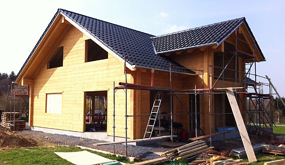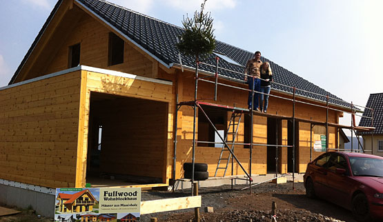 Nicht nur die Bauherren selbst sondern die gesamte Nachbarschaft ist beeindruckt, als die massiven Kiefernwände per Tieflader angeliefert werden. Die einzelnen Wandelemente hievt ein Kran an die richtigen Stellen, wo sie von den Zimmermännern in Empfang genommen und genau justiert werden. In wenigen Tagen entsteht so ein Blockhaus auf dem leeren Bauplatz, zumindest dessen Rohbau. Die Arbeiten im Innern werden noch einige Zeit in Anspruch nehmen.