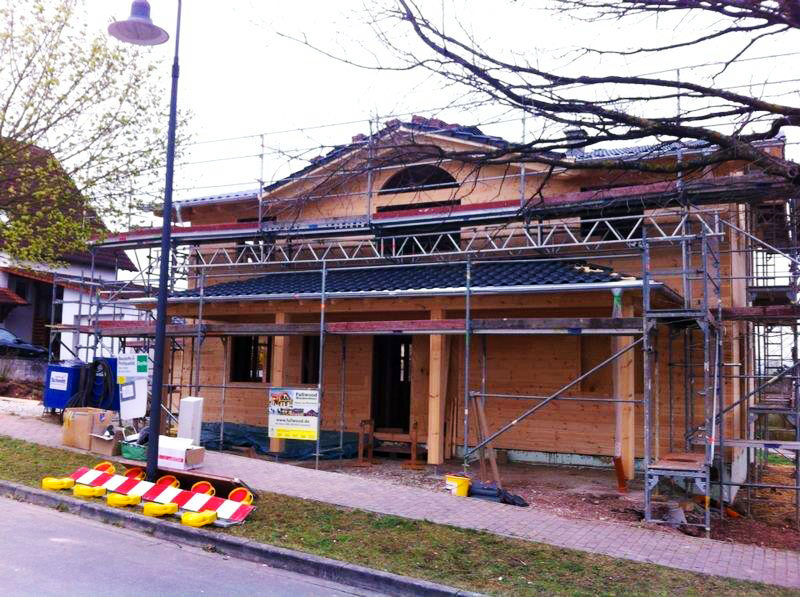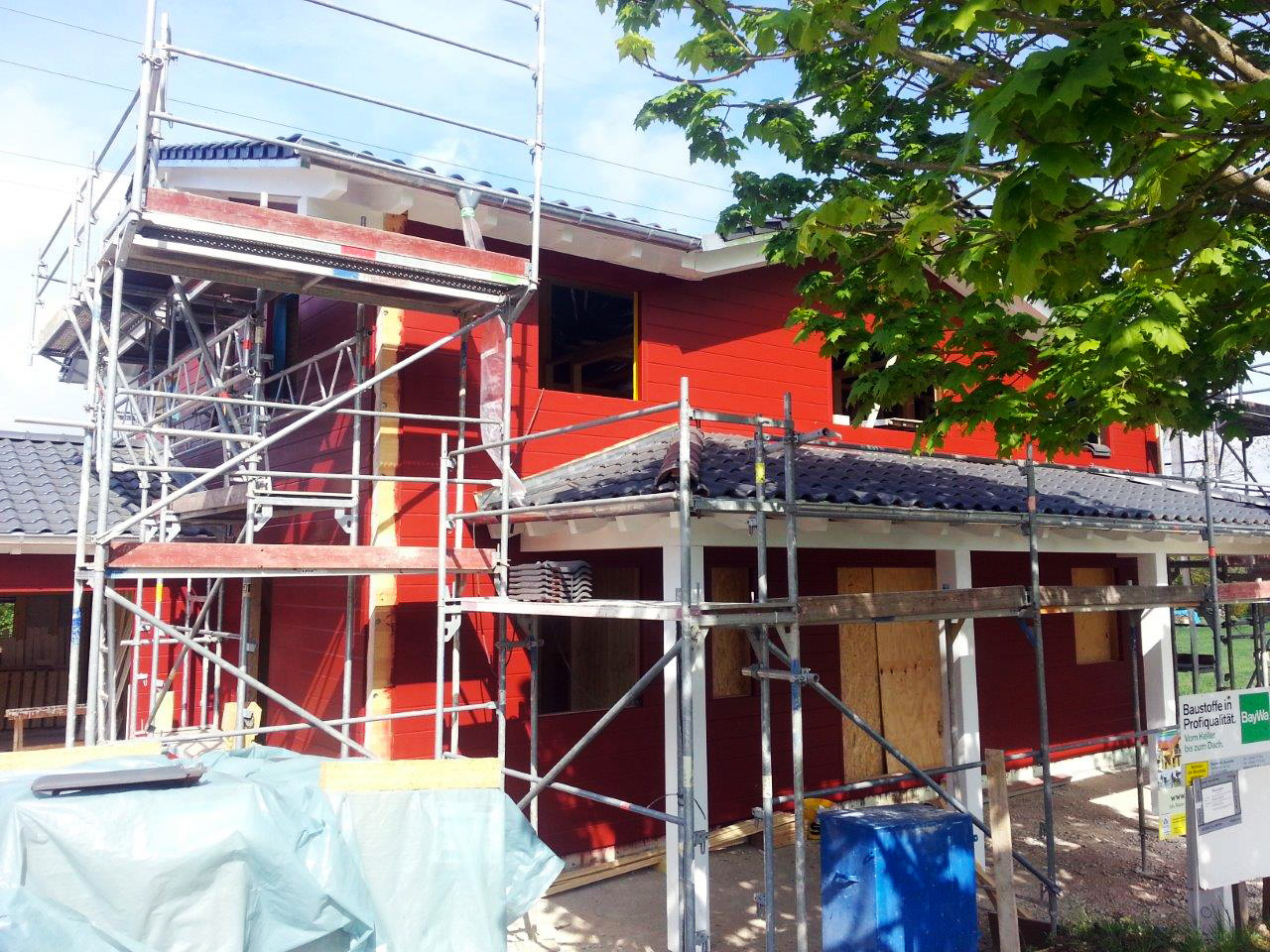 Einen Ochsenblut roten Anstrich bekommt dieses neue Blockhaus in Oberfranken. Inspiriert von den Blockhäusern in Skandinavien wählen die Bauherren einen dunkelroten Anstrich mit weißen Akzenten für ihr Traumhaus. Das sieht freundlich und einladend aus und betont beim Eintreten die Helligkeit der naturbelassenen Vollholzwände im Blockhaus. Wie die allermeisten originalen Fullwood Wohnblockhäuser wird auch dieses Blockhaus mit einer 20 cm starken Wand aus massiven Kiefernbohlen skandinavischen Ursprungs gebaut. Die im Werk vorproduzierten Wandelemente werden zur Baustelle transportiert und dort binnen weniger Tage montiert. Der Außenanstrich erfolgt vor Ort.