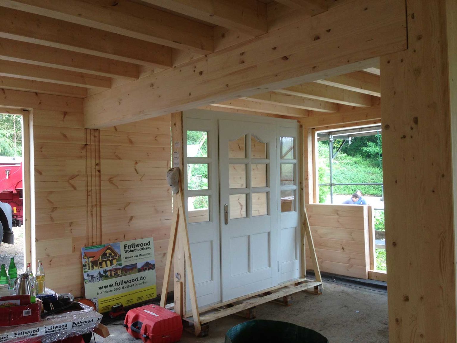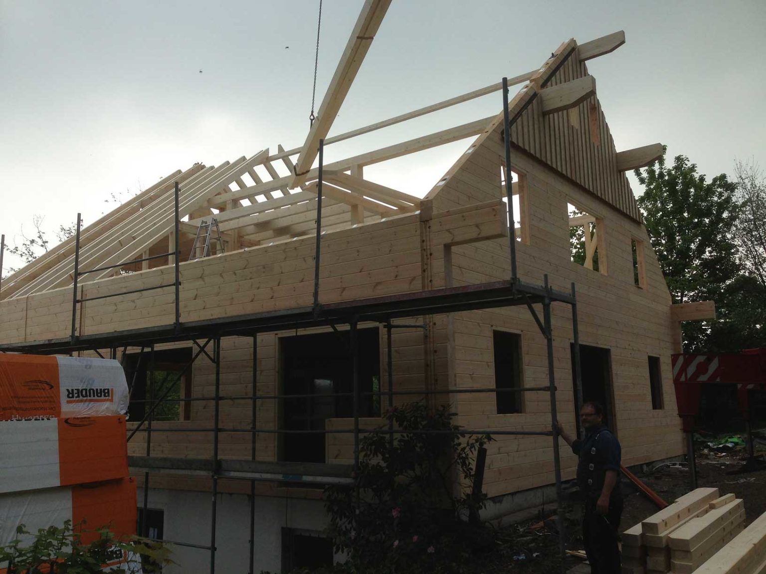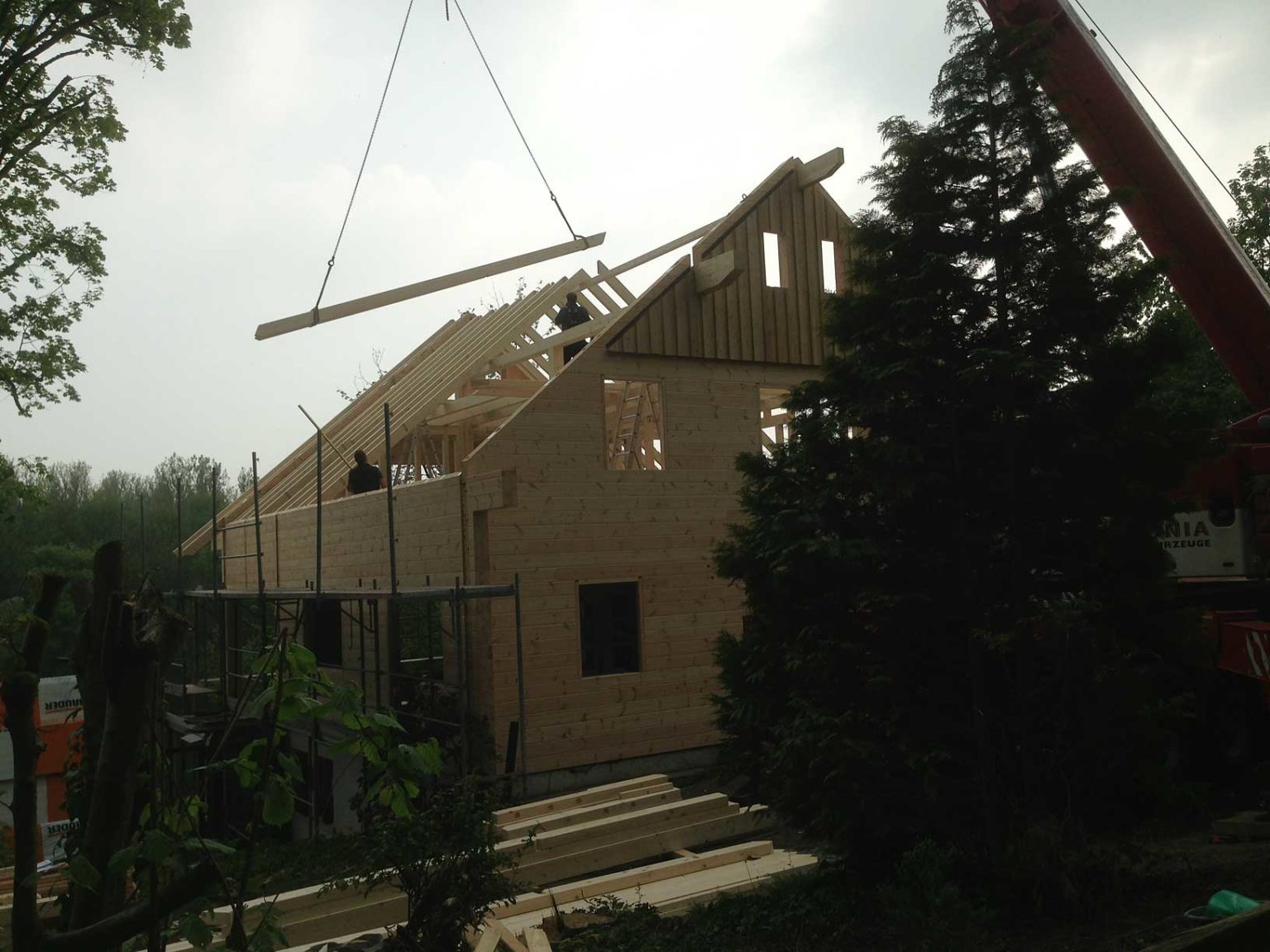 Nach dem Abriss eines Hauses in Holzständerbauweise wird auf dem vorhandenen Keller ein neues, massives Blockhaus aufgebaut. Die Fotos dokumentieren den Baufortschritt nach nur zweieinhalb Tagen Richtmeistermontage. Die Außenmaße vom Blockhaus betragen 12 x 12 m. Während der Aufbauphase wohnen die Bauherren im Kellergeschoss. Trotz der engen Zufahrt zum Bauplatz und dem zu schonenden, alten Baumbestand auf dem Grundstück meistern Fahrer und Kranführer die Anlieferung der Fertigwände problemlos. Das im Aufbau befindliche Blockhaus besteht aus 20 cm starken Vollholzwänden, das Holz kommt aus nachhaltiger, skandinavischer Forstwirtschaft.
