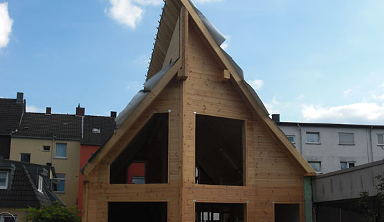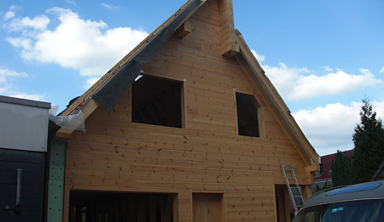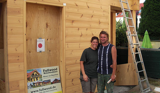 Auf ihr Blockhaus mit ungewöhnlich steilem Dach freuen sich die stolzen Bauherren schon sehr. Nicht mehr lange, und der Einzug kann stattfinden.