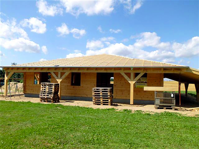 Eine Landwirtsfamilie in Mecklenburg-Vorpommern baut einen nahezu quadratischen Blockhaus Bungalow mit Walmdach und komplett ums Blockhaus laufender, überdachter Veranda. Da sie körperliche Arbeit gewohnt sind, haben sich die Bauherren kurzerhand für eine Richtmeistermontage entschieden. Nun bauen sie ihr Blockhaus unter der Anleitung und Vorarbeit eines erfahrenen Zimmermanns (Richtmeister) selbst auf und erledigen im Anschluss die Ausbauarbeiten größtenteils ebenfalls selbst. Dank der im Werk passgenau gefertigten Fertigwandelemente aus massivem Kiefernholz sind solche Richtmeistermontagen problemlos möglich, sofern man etwas handwerkliches Talent besitzt und den Willen, hart zu arbeiten. Außerdem ermöglichen die Wandelemente einen sehr schnellen Hausaufbau vor Ort, ohne Qualitätsverlust. Auf das Wohnen und Leben in ihrem individuellen Blockhaus freuen sich die Bauherren natürlich sehr, erfüllen sie sich damit doch einen lang gehegten Traum.