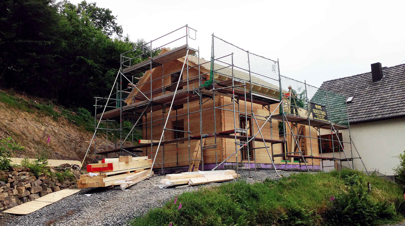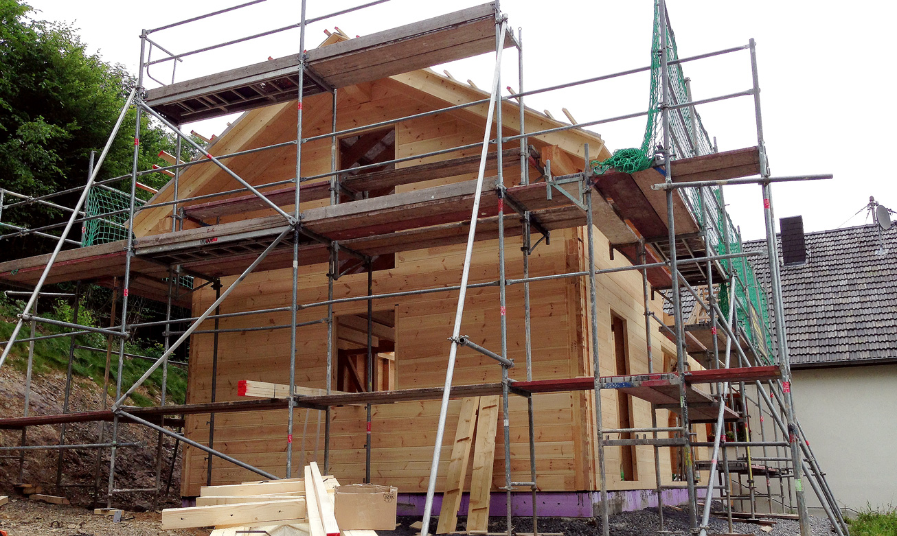 Der Bauherr baut sein massives Blockhaus an ein bestehendes Steinhaus an mitten in der Natur. Das ist dank der setzungsfreien Fertigwände von Fullwood ohne Probleme machbar. Schwierig ist bei dieser Baustelle nur die Zufahrt durch einen Wald. Da muss der Fahrer des Tiefladers, der die riesigen, fertigen Wandelemente anliefert, ganz schön aufpassen. Wie man sieht, ist alles gut gegangen. Sowohl Bauherr als auch Bauherrin packen - mit ein paar befreundeten Helfern - bei der gebuchten ”Richtmeistermontage“ kräftig mit an, so dass bereits nach nur einem einzigen Tag die Vollholzwände stehen, der Dachstuhl montiert ist und die Unterspannbahn samt Dachlatten aufgebracht sind. Damit das Blockhaus schnellstmöglich bezugsfertig ist, herrscht auf der Baustelle emsiges Treiben und der Ausbau macht täglich Fortschritte. Bald heißt es dann nur noch Genusswohnen im echten Blockhaus von Fullwood.