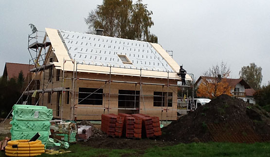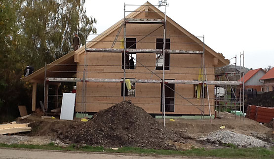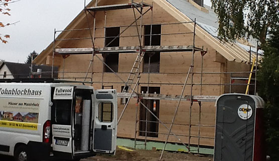 Fast so einfach, wie mit Legosteinen bauen, geht die Montage von diesem Blockhaus vonstatten. Die einzelnen, im Werk passgenau gefertigten Wandelemente aus dreifach laminierter nordischer Kiefer, werden pünktlich zur Baustelle geliefert und dort mittels Kran und "starker Männer" auf den Bauplatz gehievt und in Position gebracht. Nicht Stein auf Stein, sondern Holzwand auf Holzwand geht es dann weiter und nach nur einer Woche besitzt der Rohbau schon einen sichtbaren Dachstuhl, eine Aufdachdämmung und ein fertig eingedecktes Dach. So schnell kann`s gehen bei fleißigen Häuslebauern und bei perfekter Planung.