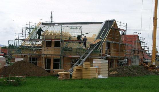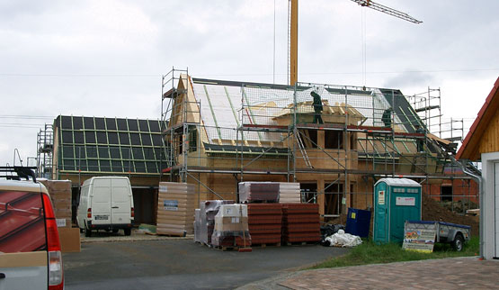 Ein weiteres Beispiel für die individuelle Planung nach Bauherrenwunsch ist dieses im Bau befindliche Blockhaus mit "rundem" Erker und "Türmchen". Leicht verspielt und romantisch muten die Details des Gebäudes an; sie passen gut in die Gegend. Ganz und gar bodenständig und klar geht es hingegen beim Aufbau und Ausbau vom Blockhaus zu, bei dem auch der Bauherr selbst mit anpackt. Unter der Regie des Richtmeisters, einem Zimmermann von Fullwood, kommen er und seine Helfer gut zurecht.