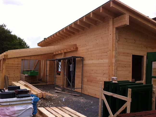 Es muss nicht immer gleich ein komplettes Einfamilienhaus sein. Fullwood kann auch ein kleines Blockhaus an bestehende Häuser anderer Materialien anbauen. Dies ist durch die moderne Fertigungstechnik möglich, die das familiär geführte Unternehmen im Laufe der letzten 4 Jahrzehnte entwickelt hat. Bei diesem massivem Blockhaus reisen die Monteure früh morgens zusammen mit den Wandelementen aus 20 cm starker Kiefer an und montieren im Handumdrehen den modernen Pultdach-Anbau. Drinnen gibt es einen sichtbaren Dachstuhl, um den Raum nach oben zu vergrößern und ein ganz spezielles Ambiente zu erzeugen.