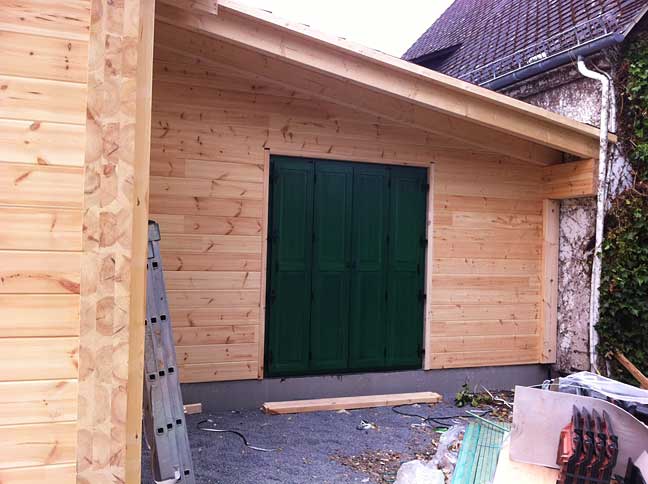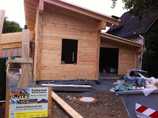In der Vulkaneifel wird ein Blockhaus an das bestehende Elternhaus aus Stein angebaut. Das setzungsfreie Fertigbausystem von Fullwood Wohnblockhaus macht`s möglich.