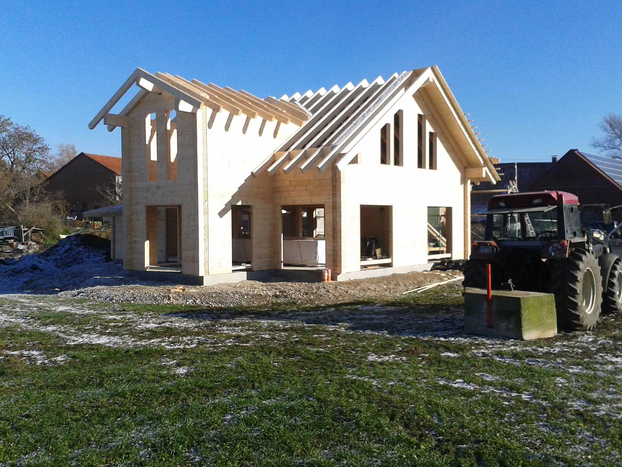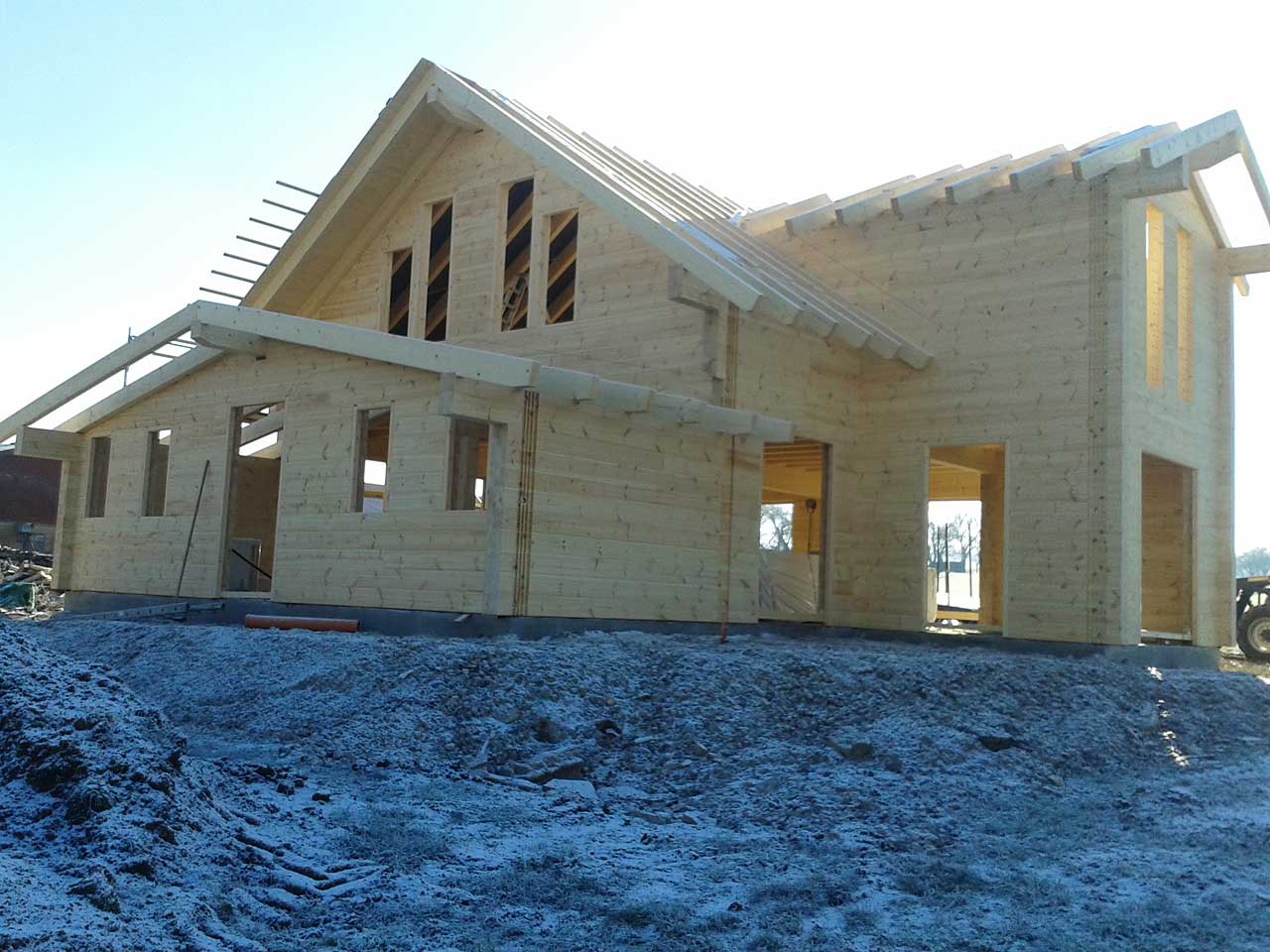 Fast 2 Jahre dauert es, bis der Bauherren sein Blockhaus endlich genehmigt bekommt. Leider gibt es immer wieder mal Vorurteile seitens mancher Gemeinden gegen massive Blockhäuser. Da lohnt es sich für Bauherren dran zu bleiben und ihren Traum vom Blockhaus nicht gleich aufzugeben - in den allermeisten Fällen klappt das. Das neue Blockhaus wird akribisch in enger Zusammenarbeit von Bauherren und Fullwood geplant und als Richtmeistermontage mit Hilfe von Familie und Freunden aufgebaut. Wie den meisten Bauherren ist auch diesen Wärmeeffizienz sehr wichtig, weshalb sie sich für die 20 cm starke Vollholzwand von Fullwood Wohnblockhaus entscheiden. Außerdem mögen sie den hellen, glatten Look der massiven Fertigwand.