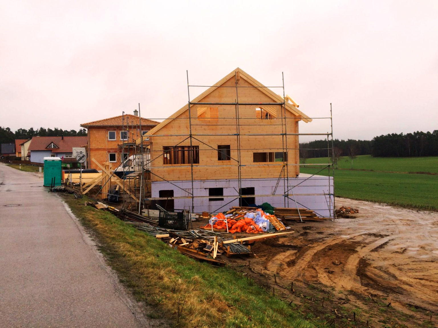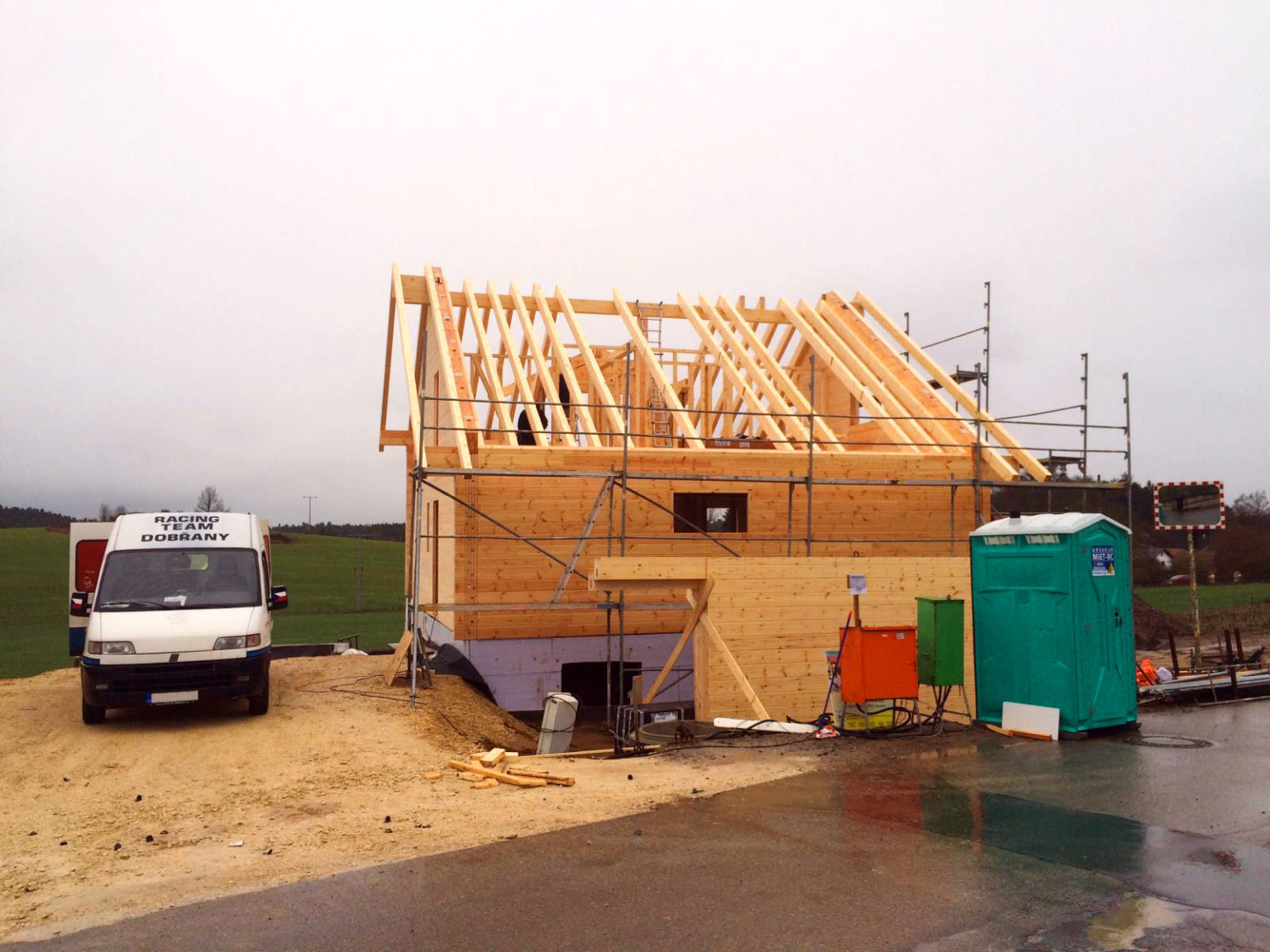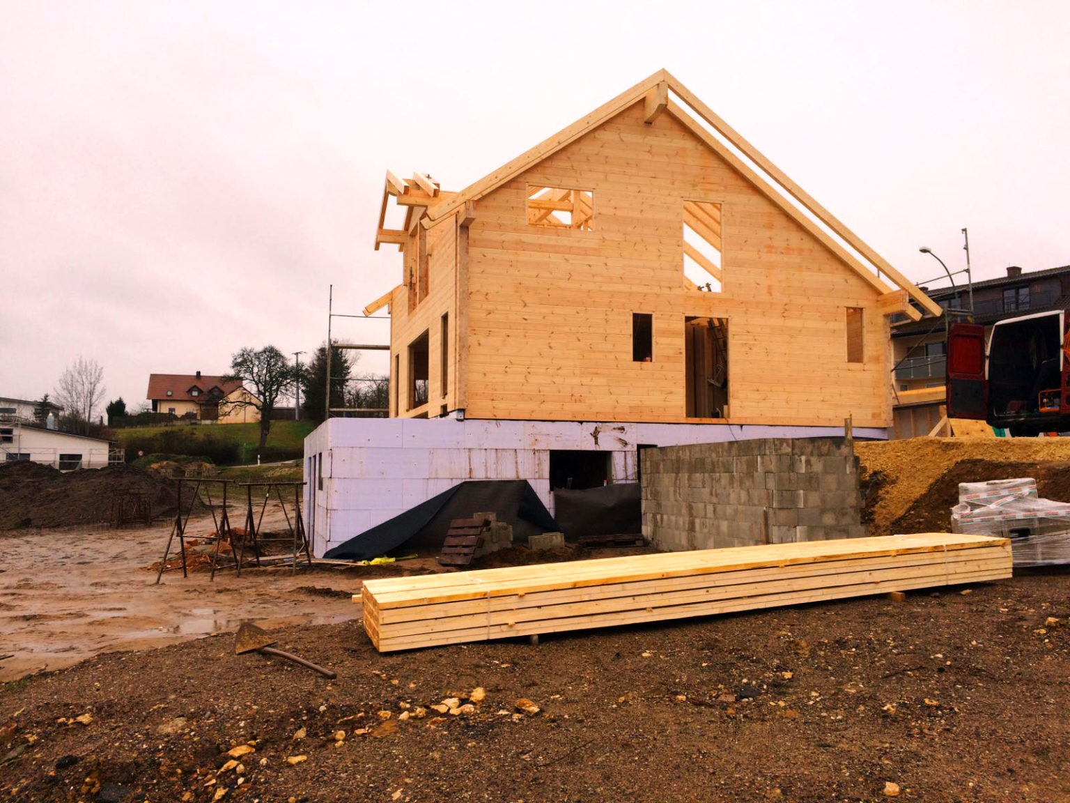 Die Bauherren von diesem neuen Blockhaus in Bayern bauen zuerst das Kellergeschoss und setzen danach die im Werk gefertigten Wandelemente aus Polarkiefernholz mittels Kran darauf. Dank der innovativen Fertigungstechnik sind die holzmassiven Wandelemente von Fullwood Wohnblockhaus setzungsfrei und damit kompatibel mit Mauerwerk, Glas und vielen anderen Materialien. Durch das Gefälle des Baugrundstücks und einen Erdaushub zur Bergseite hin, ist das Kellergeschoss komplett bewohnbar. Es besitzt rundum große Fenster sowie Türen zum Garten hin. Beim Aufbau ihres Blockhauses arbeiten die Bauherren fleißig mit und sparen so den Großteil der Montagekosten ein. Angeleitet und tatkräftig unterstützt werden sie von einem erfahrenen „Richtmeister“ (Zimmermann). Da die Bauherrschaft unbedingt ein durch und durch massives, also einschaliges, Blockhaus bauen möchte, ist die 20cm dicke Vollholzwand von Fullwood eine ausgezeichnete Wahl, auch hinsichtlich Wärmeschutzverordnung.