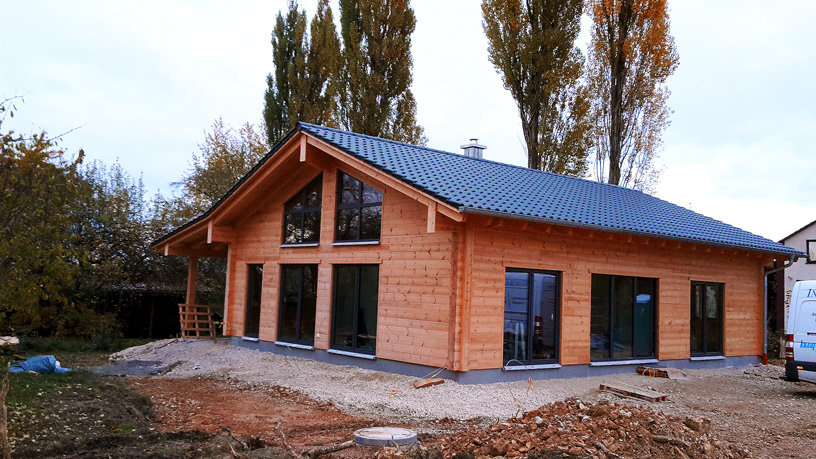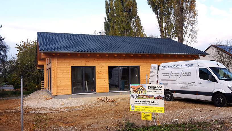 Seit die Baustellenfotos gemacht wurden, ist einige Zeit verstrichen und der Baufortschritt ist rasant. Es handelt es sich um ein eingeschossiges Blockhaus, mit flacher Satteldachneigung und zwei großen Giebelfenstern. Viel natürliches Licht im Blockhaus ist der Bauherrschaft ganz besonders wichtig, deshalb gibt es rundherum sehr viel Fensterfläche, größtenteils sogar bodentief. Wie so vielen Fullwood-Kunden gefällt auch diesen die schlichte, glatte Wandoptik bei gleichzeitig einschaliger, massiver Blockwand, ganz besonders.