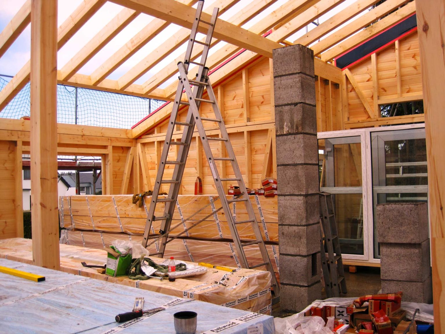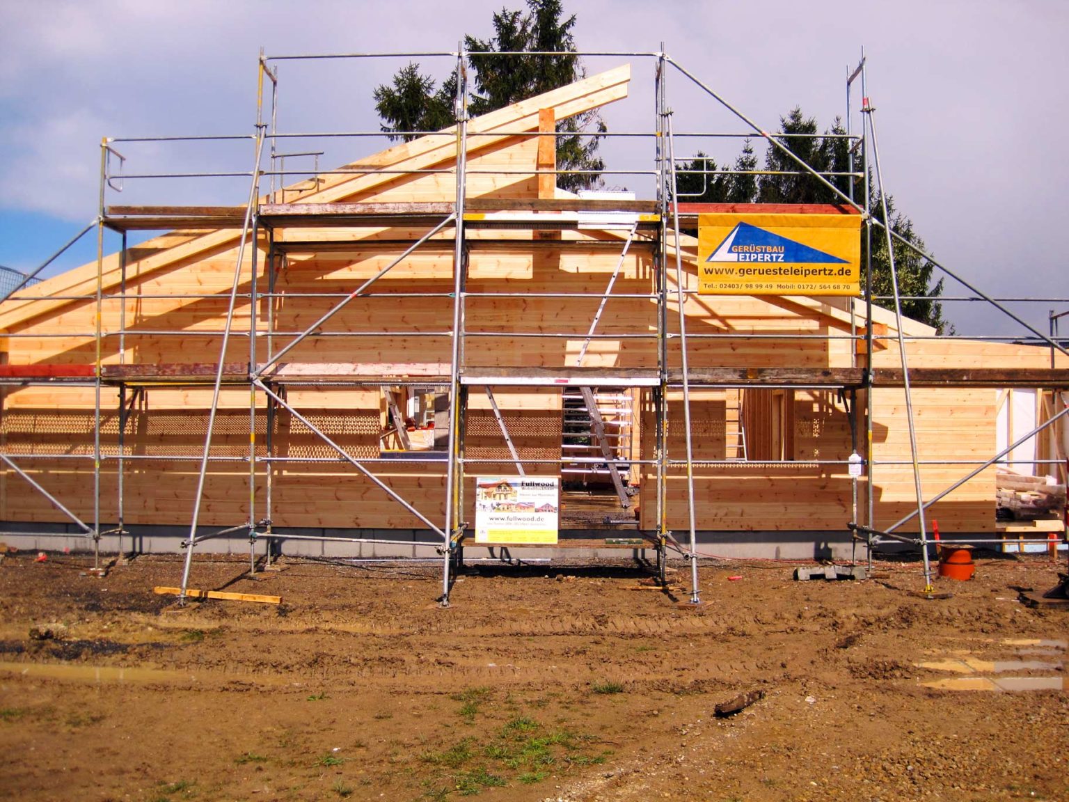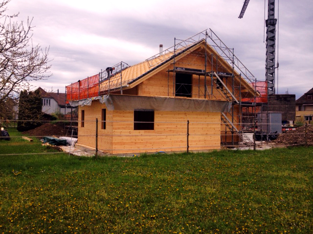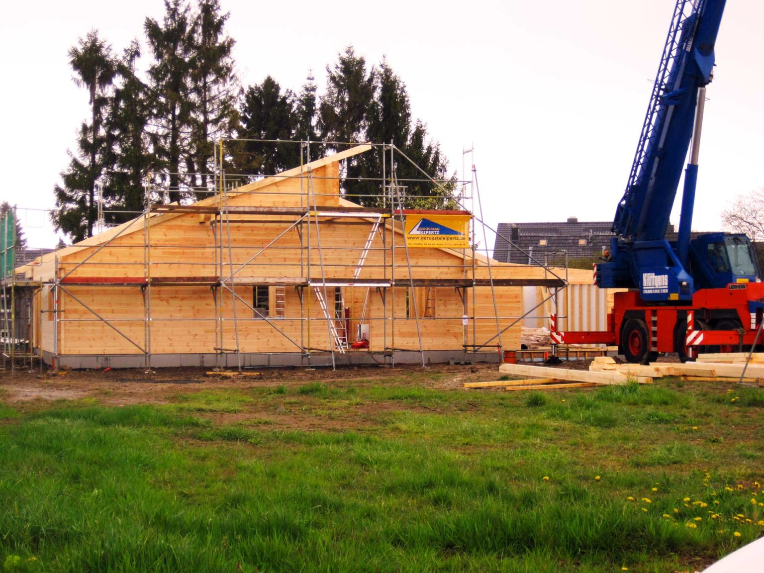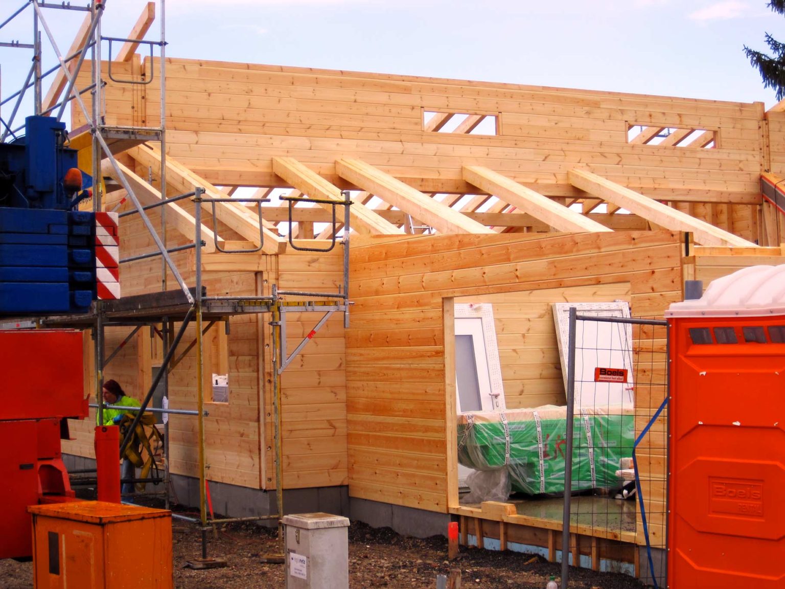 Im Münsterländchen entsteht dieses unkonventionelle Blockhaus. Durch die Pultdachkonstruktion mutet das Gebäude schon jetzt modern an, besonders für ein echtes Blockhaus. Durch die abgestuften Dachhöhen ist ein Teil des Gebäudes höher als der andere und bietet somit deutlich mehr Platz im Dachgeschoss und einen hohen Loftraum im Erdgeschoss. Was auf den ersten Blick eingeschossig wirkt, ist bei näherer Betrachtung doch ein anderthalbgeschossiges Blockhaus. Nachdem das Gebäude in wenigen Tagen mittels Kran aufgestellt wurde und der Dachstuhl vor Ort gezimmert wurde, beginnen die Dachdecker ihre Arbeit und der Innenausbau geht los. Dank der passgenau vorgefertigten Vollholzwandelemente und Dachbalken gehen die Arbeiten schnell und unkompliziert voran, trotz des widrigen Wetter!