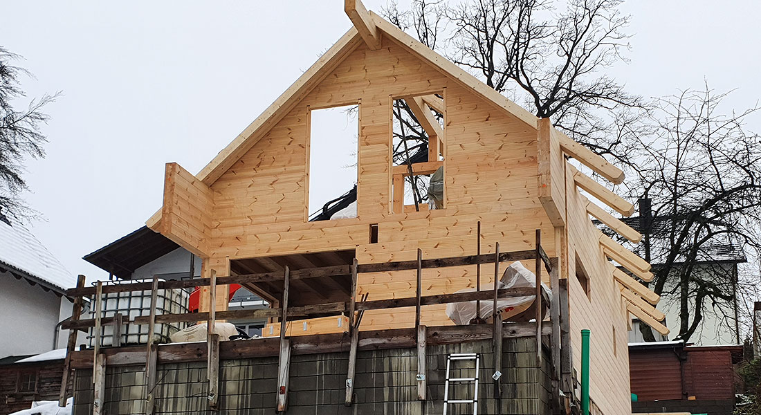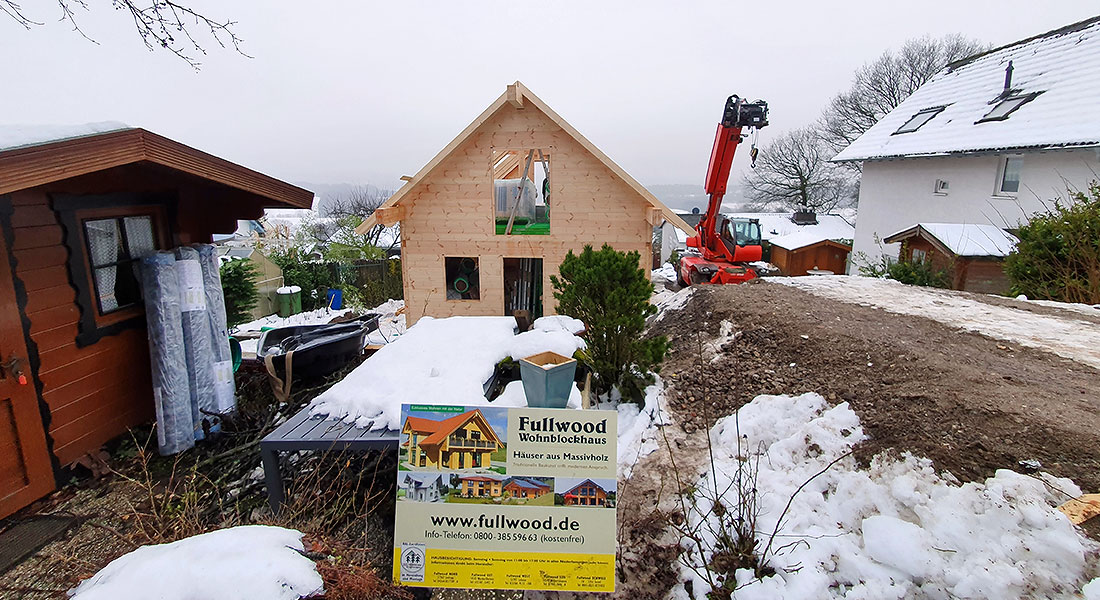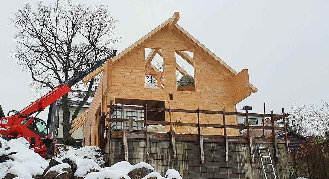 Aufgrund der unzugänglichen Hanglage mit einem großen Baum, der erhalten werden soll, ist es hier nicht möglich einen großen Baukran herzuschaffen. Stattdessen kommt ein „Manitou“ zum Einsatz, für den eigens eine Baustraße gebaut wird. Damit daraufhin auch der Tieflader mit den Wandelementen anfahren kann, wird die Baustraße entsprechend umgebaut. Nun ist der Transporter wieder weg und wenn der Manitou nicht mehr gebraucht wird, muss die Baustraße erneut zurückgebaut werden. Ursprünglich hat sich die Bauherrschafft schon für einen anderen Blockhaus Hersteller entschieden – da sie keine einschaligen Massivholzwände möchte –, der sich aber nicht in der Lage sieht, dort ein Haus zu bauen. Wir sind willens und in der Lage die Wünsche auch dieses Bauherren zu erfüllen und verwenden für sein Blockhaus unsere Kombiblockwand mit Kerndämmung (9cm-Block). Denn geht nicht, gibt´s (fast) nicht!