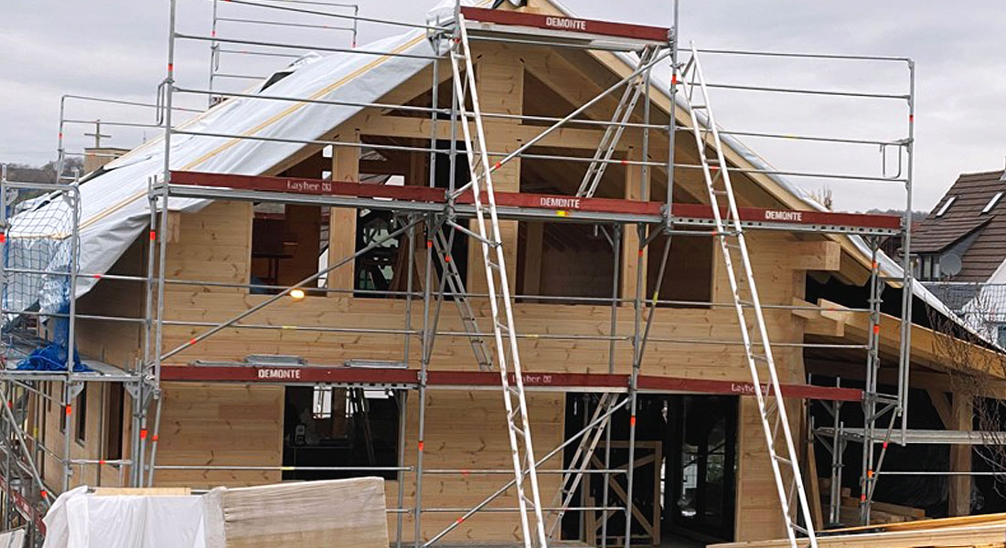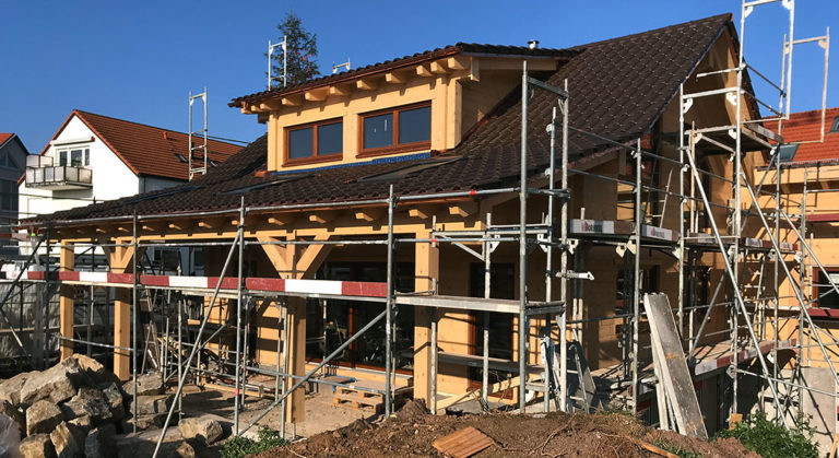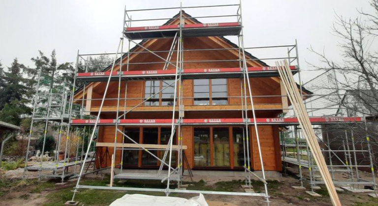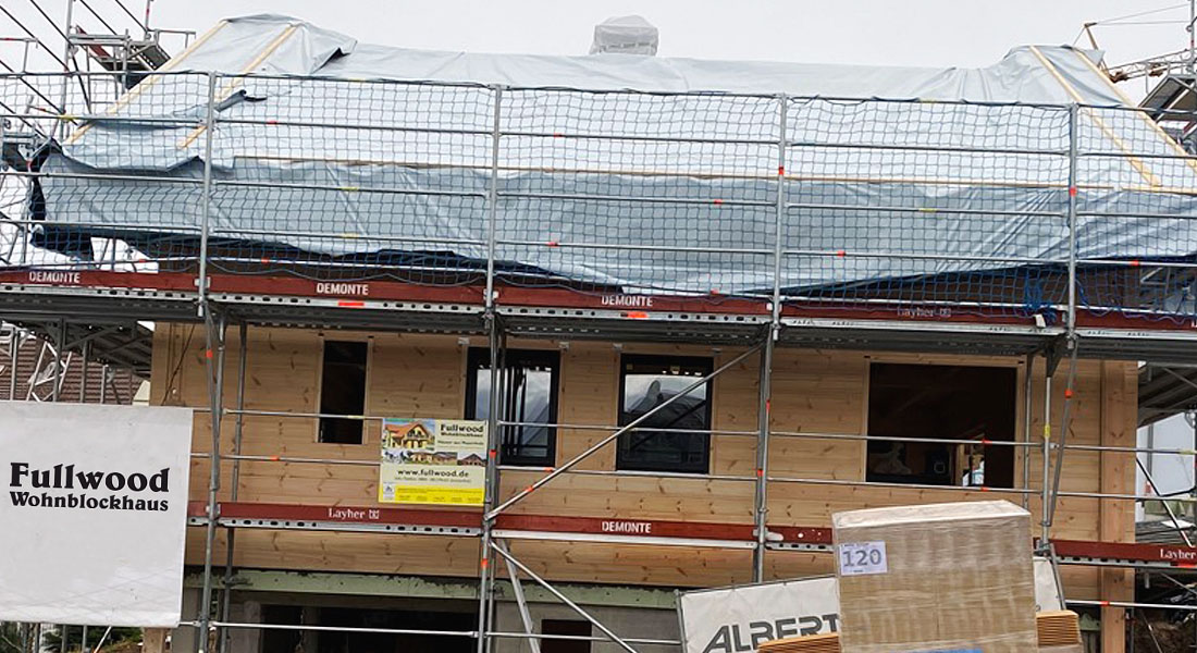 Nicht nur einen Hang zu Blockhäusern haben die Bauherren, sondern sie bauen ihr Blockhaus auch am Hang. Dies erfordert einen Keller, der teilweise in den Hang gebaut ist, aber größtenteils überirdisch steht und ermöglicht unter anderem eine Nutzung des Untergeschosses als Garage. Für ihr Blockhaus baut die Baufamilie mit der 20er Blockwand, die durch und durch aus massivem Kiefernholz besteht, ohne irgendeine zusätzliche Dämmschicht.