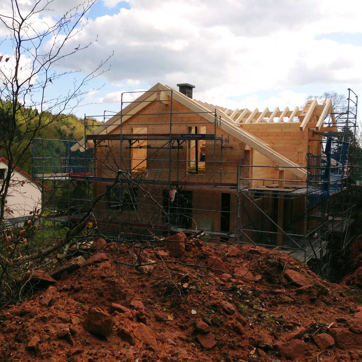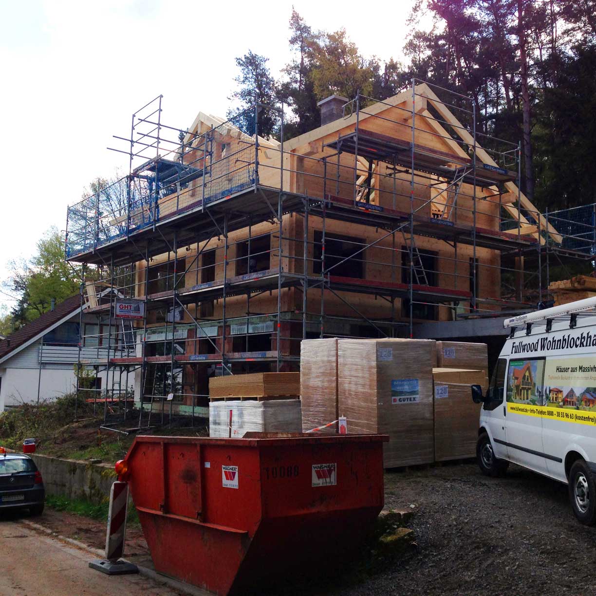 Errichtet wird das unterkellerte Blockhaus komplett von den erfahrenen Fullwood-Profis. Natürlich sind auch diese Blockwände im Werk maßgenau vorgefertigt worden und die Montage der setzungsfreien Wandelemente geht zügig vonstatten. Dank der besonders dicken Wandstärke ist der U-Wert der Kiefernwände für ein massives Blockhaus auch besonders niedrig.