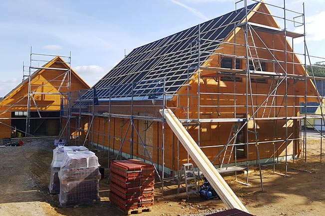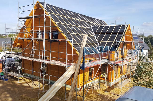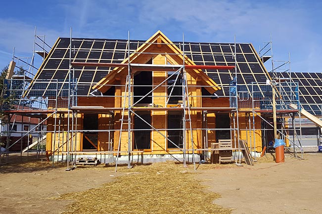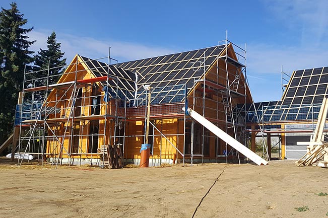 Hier entsteht außerdem eine Doppelgarage wenige Meter neben dem Blockhaus. Die beiden Gebäude sind mit einem überdachten Durchgang verbunden. Viel Platz und Komfort also für die Bauherren und ihre Fahrzeuge. Die Hausmontage erfolgt wie gewohnt in wenigen Tagen (Rohbau) und der Ausbau im Blockhaus läuft bereits auf Hochtouren.