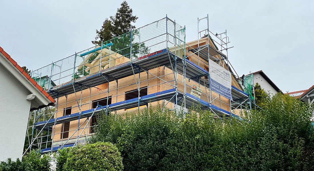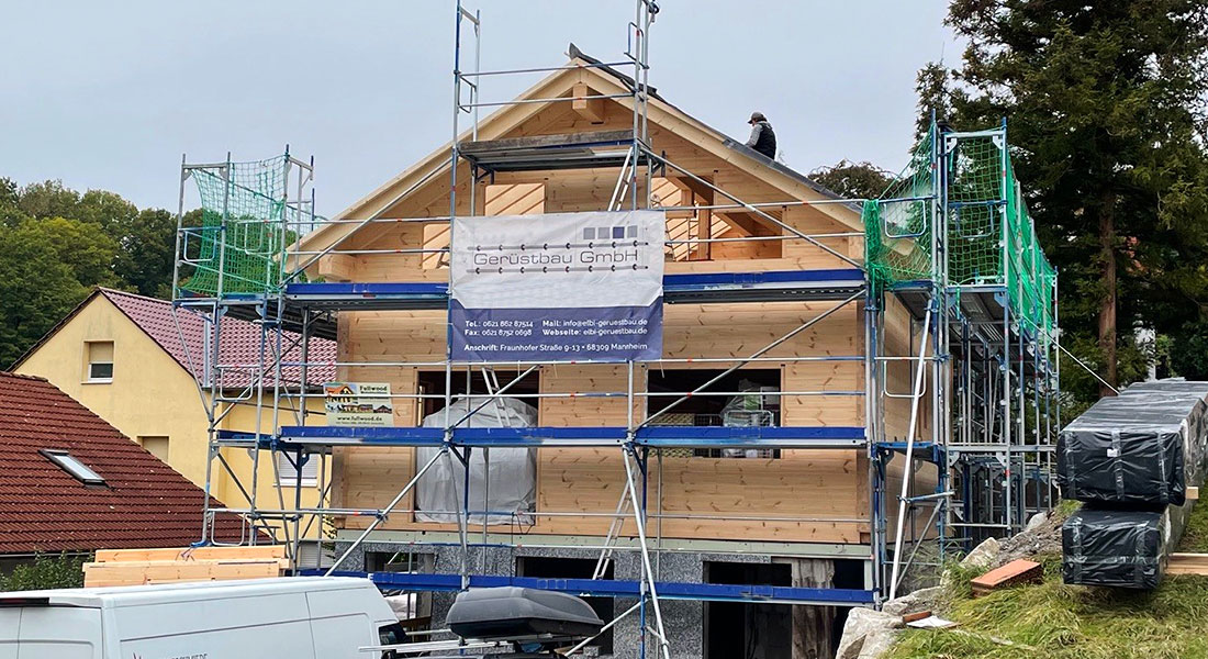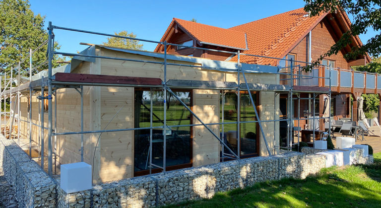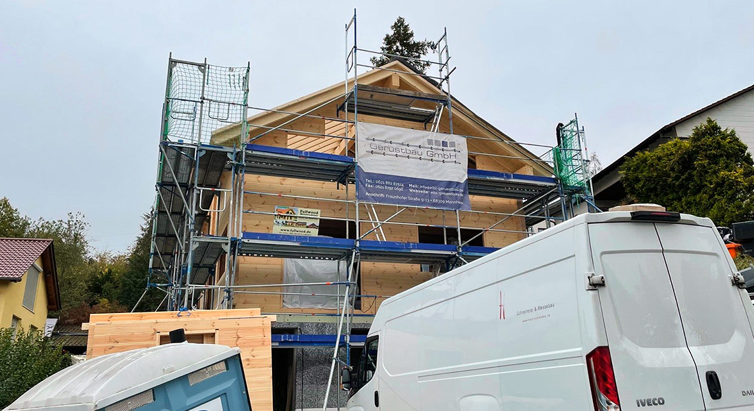 Hier baut Fullwood ein massives Blockhaus auf einen Keller, der im Vorfeld von einer externen Kellerfirma erstellt wurde. Wie immer hat die Bauherrschaft vom Entwurf bis zur Baustufe das Sagen und alles geschieht unter dem Motto „Kunde König“. Neben einem „normalen“, also verschalten Dachstuhl wünscht sich das Baupaar für ihr Blockhaus eine Dachgaube mit Fernsicht, einen großen Balkon und ein Gerätehaus.