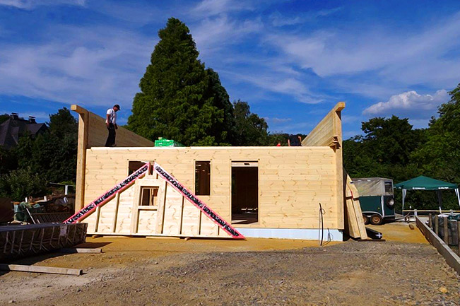Die Baufamilie entscheidet sich dafür, ihr Blockhaus mit der Kombiblockwand bauen zu lassen. Dabei lässt man es sich nicht nehmen, selbst mit Hand anzulegen und den Richtmeister bei der Hausmontage mit vereinten Familienkräften zu unterstützen. Wieder ein weiteres Blockhaus, das ganz nach Bauherrenwunsch geplant und gebaut wird. Inklusive späterem individuellen Genusswohnen.