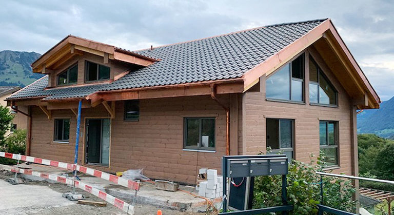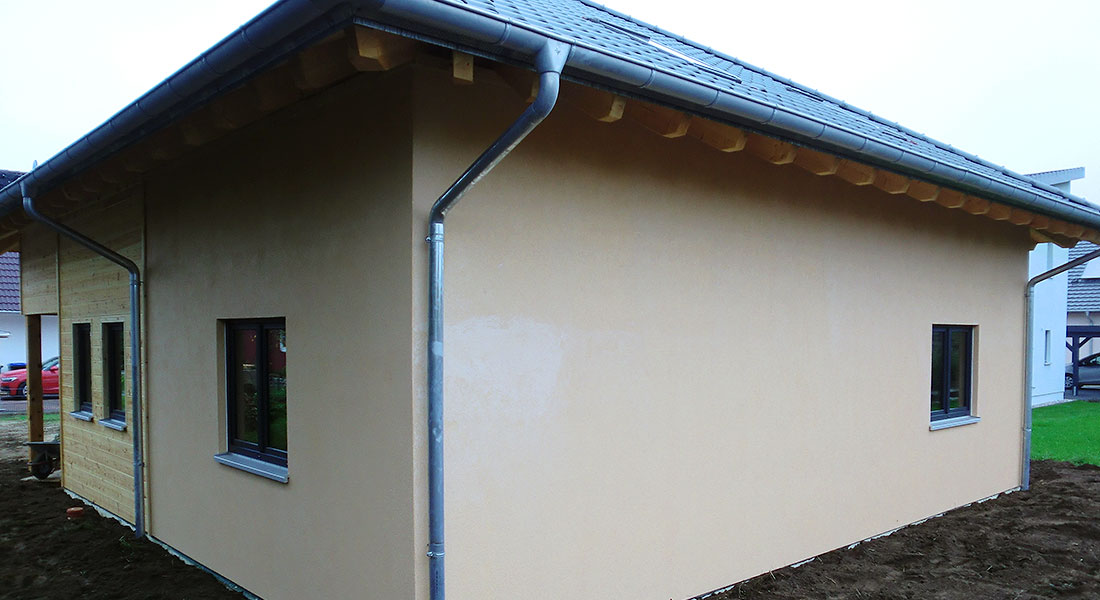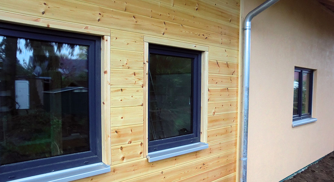 Abgespeckte Form zumindest äußerlich, denn im Hausinnern bestehen die tragenden Außenwände alle aus Blockbohlen, die an der Außenseite zum Teil mit Putzträgerplatten verdeckt wurden. Dazwischen befindet sich eine Kerndämmung. Die erlaubten 30 Prozent Holzfassade nutzt das Blockhaus selbstverständlich aus. So freuen sich die Bauherren vor allem im Hausinnern über ihr wohngesundes Blockhaus und können gut mit der Bauvorschrift leben. Schließlich kommt es besonders auf die inneren Werte an. Da der Bauherr gelernter Tischler und Zimmermann ist, baut er sein Blockhaus selbst mit auf und macht auch viel im Innenausbau.