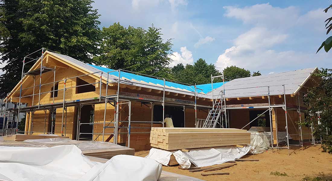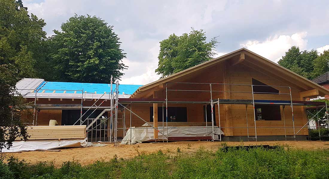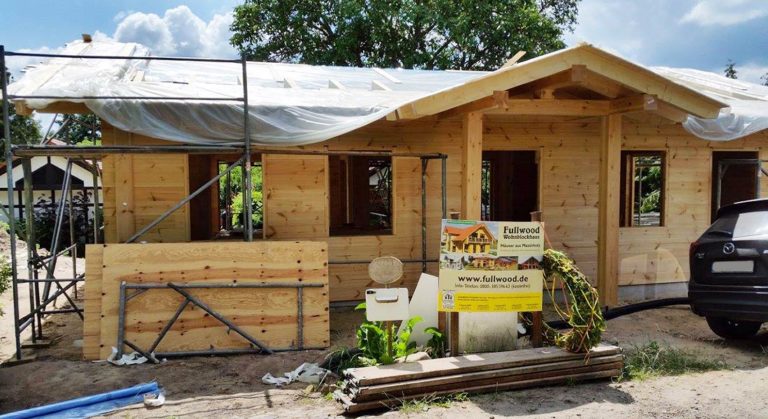 Hier entsteht ein eingeschossiges Blockhaus in Winkelform aus einschaligen Kiefernblockwänden. Errichtet wird das neue Blockhaus von den Fullwood-Monteuren mit etwas Unterstützung der Bauherren.