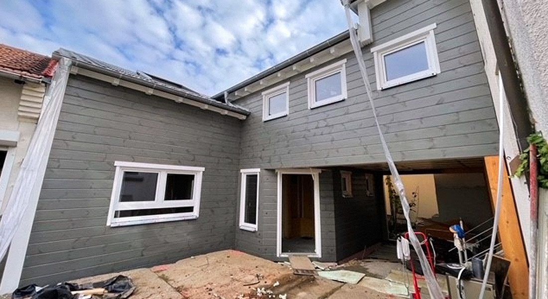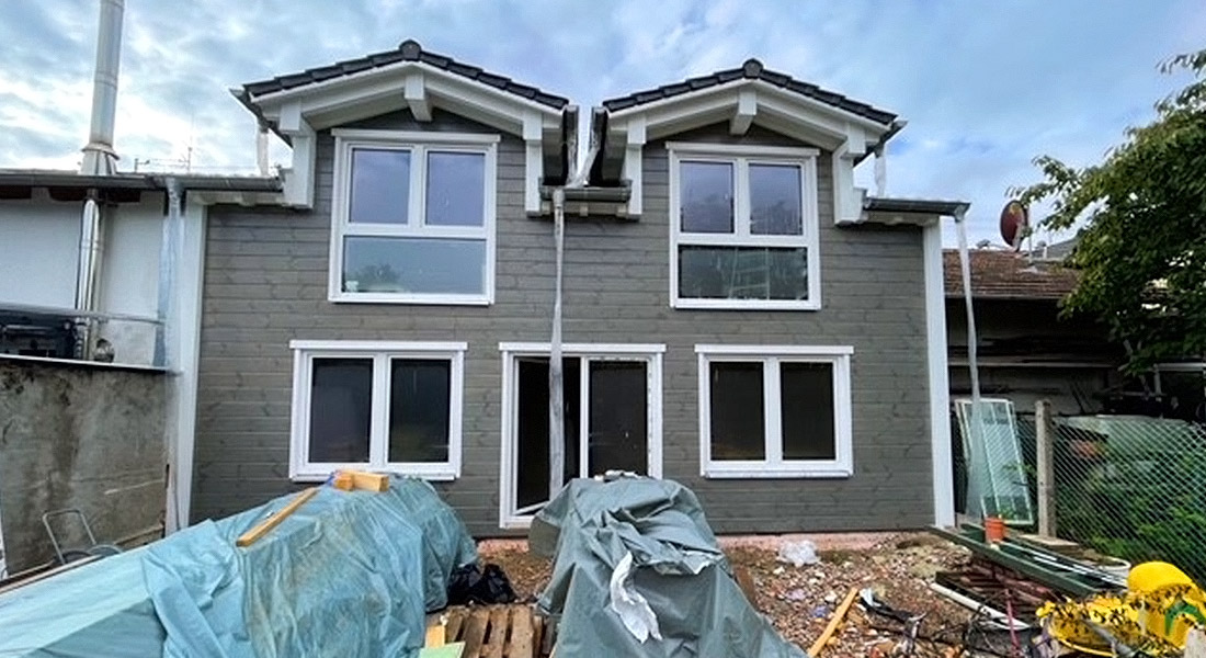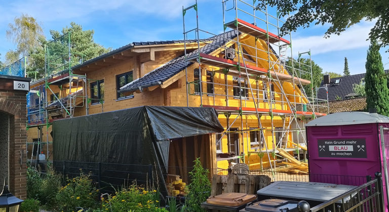 Nach dem Abriss einer Scheune wird hier die entstandene, enge Lücke für einen Anbau genutzt. Ein Blockhaus in nachhaltiger ökologischer Bauweise soll es sein ohne Setzungsverhalten und mit einschaligen Blockwänden, kurz: ein massives Blockhaus von Fullwood Wohnblockhaus. Derzeit erfolgt die Erweiterung des Bestandshauses Schlag auf Schlag.