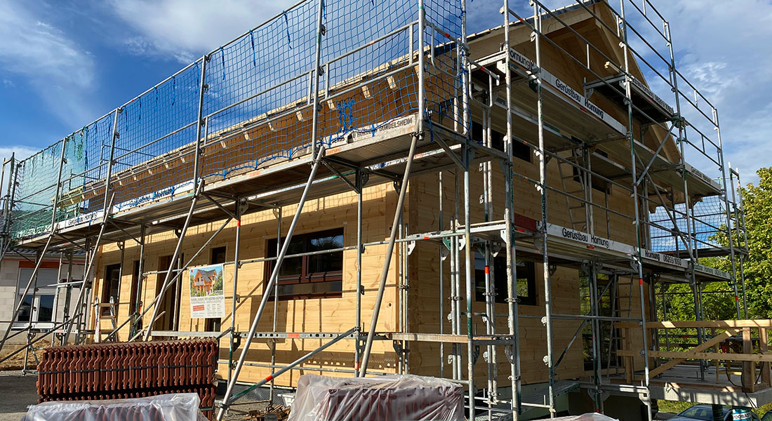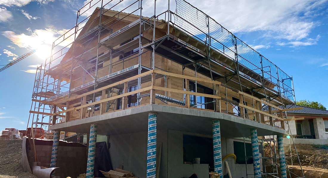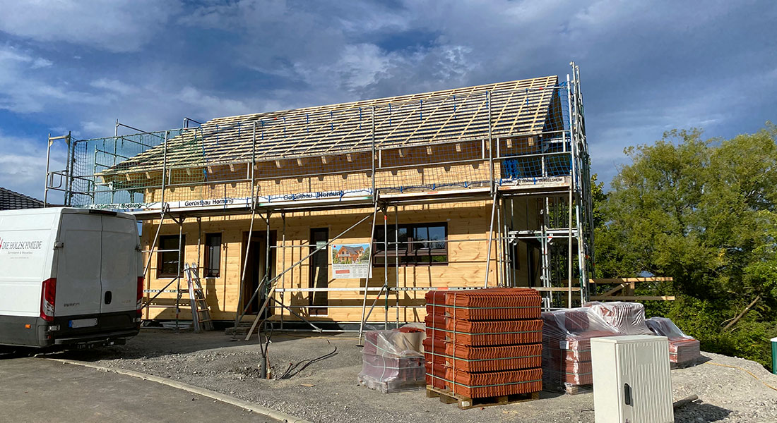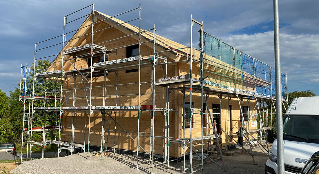 Hier entsteht ein weiteres Beispiel für ein Fullwood Wohnblockhaus, das auf einem teilweise in den Hang gebauten Untergeschoss aufgebaut wird. Die 20cm dicken Blockwände bestehen durch und durch aus massivem Kiefernholz und besitzen keine zusätzliche Dämmschicht. Die Voraussetzungen der EnEV werden dennoch erfüllt. Da die Außenwände des Blockhauses keine Installationsebene besitzen, werden sämtliche Kabelkanäle im Vorfeld durchdacht, geplant und vorgebohrt. Die Baufamilie und ihre Eltern helfen bei der Wandmontage mit und erledigen den Innenausbau in Eigenregie.