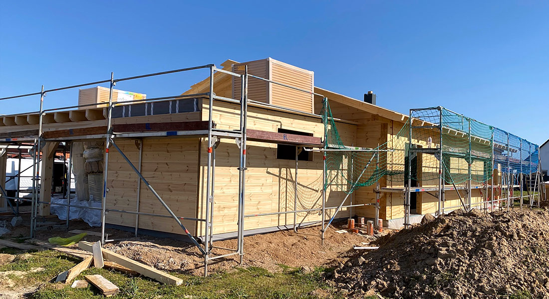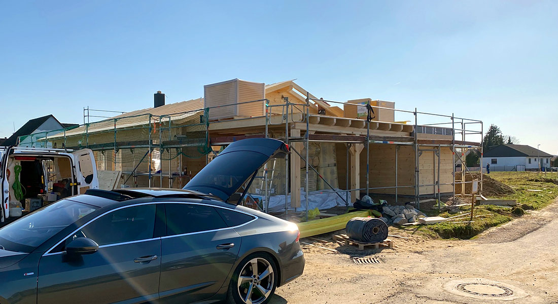 Als Richtmeistermontage mit offenem Sichtdachstuhl wird dieses individuelle Blockhaus gebaut. Dabei baut die Bauherrschaft gemeinsam mit dem Vater und dem Fullwood-Richtmeister ihr Blockhaus ganz alleine auf! Die Bodenplatte entstand zuvor komplett in Eigenarbeit. Ein großes Doppelcarport mit Schuppen wird ebenfalls gebaut. Das Blockhaus wird ausschließlich mit der einschaligen Massivholzwand gebaut.