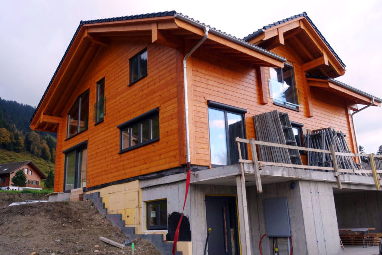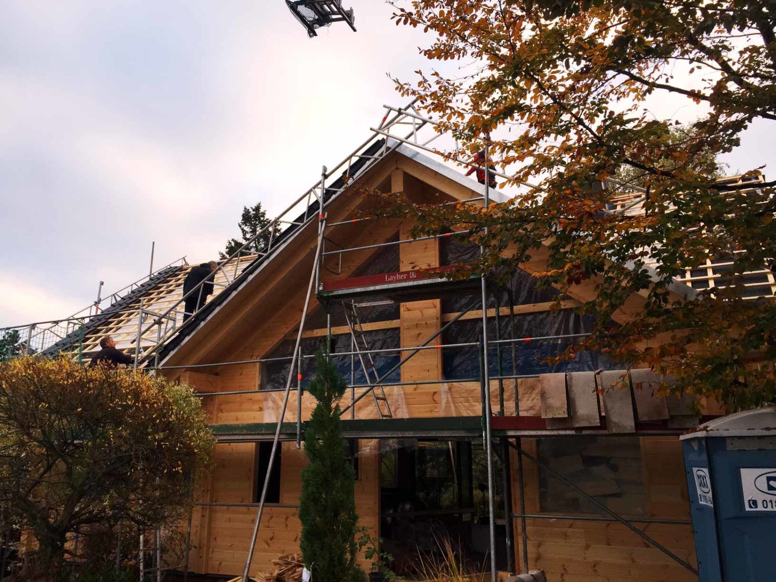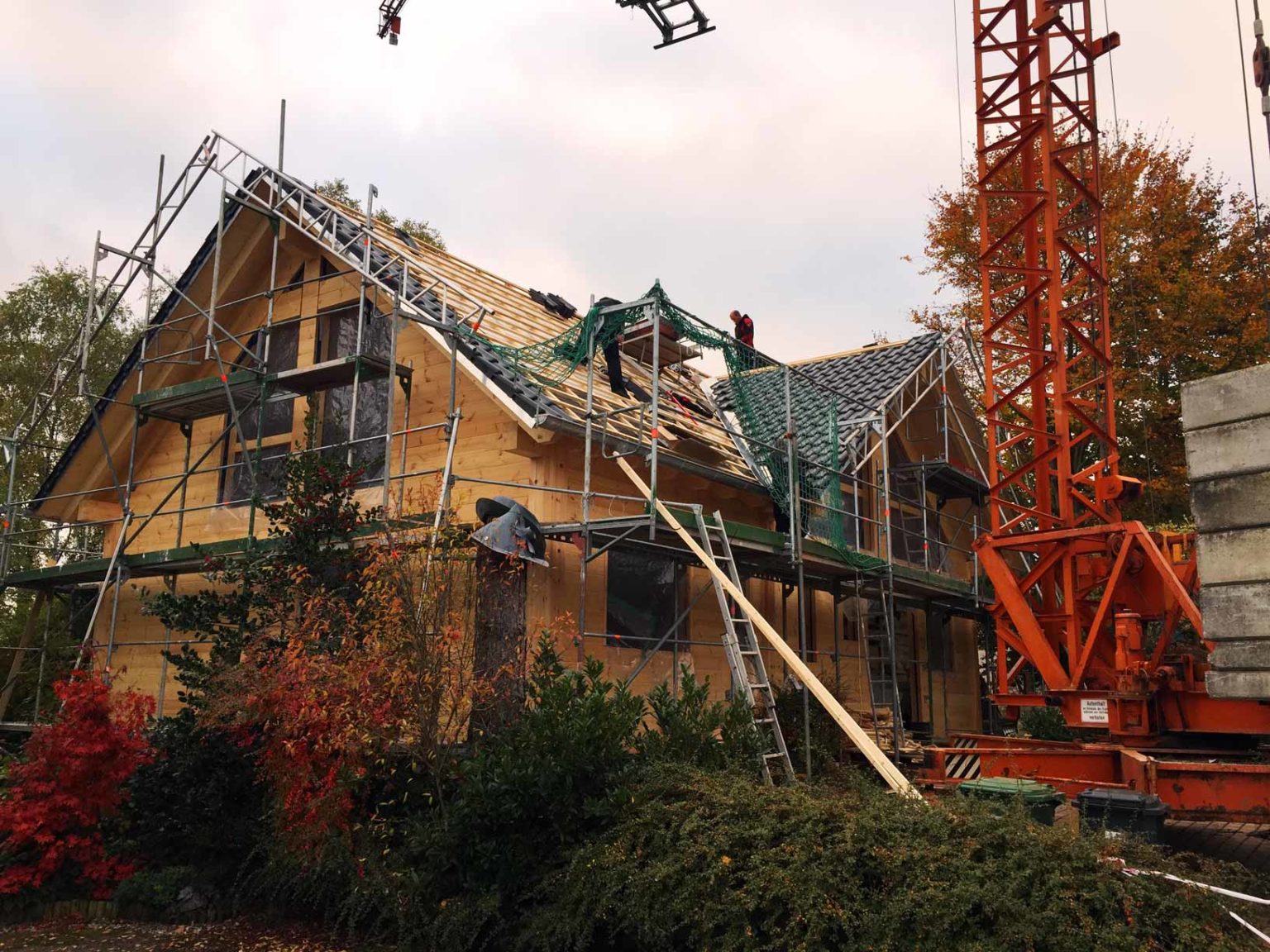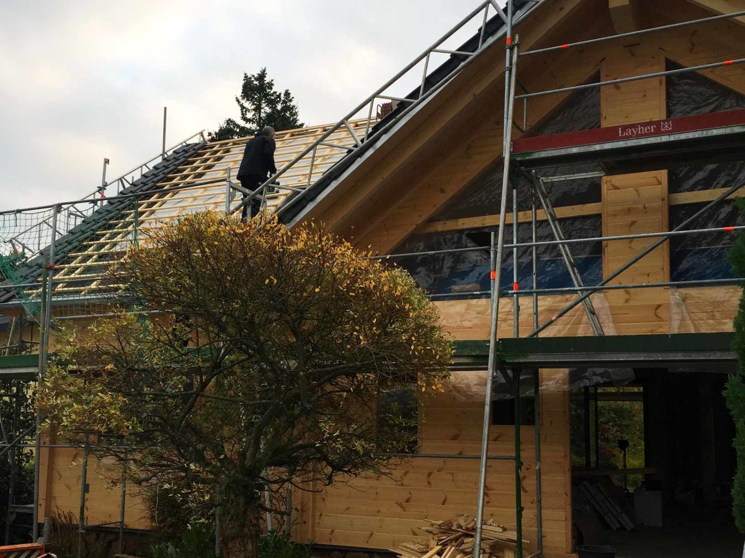 Bevor die Planung und der Bau für dieses neue Blockhaus beginnt, musste erst das alte Fertighaus aus den 70er Jahren wegen Schimmel abgerissen werden. Auf dem frei gewordenen Baugrundstück entsteht nun ein wohngesundes, echtes Blockhaus von Fullwood - das bleibt garantiert ewig schimmelfrei! Montiert werden die im Werk gefertigten Wandelemente auf dem vorhandenen, intakten Keller. Dank der perfekten Holztrocknung im Vorfeld und der Fertigkonstruktion sind die Fullwood-Wände setzungsfrei und können einfach auf das Kellermauerwerk gesetzt werden. Sehr große, bodentiefe Fenster und ein dritter Giebel schmücken das Blockhaus und verleihen diesem Transparenz und reichlich natürliches Licht. Im Innern beeindruckt das Blockhaus mit einem imposanten Sichtdachstuhl.