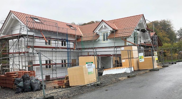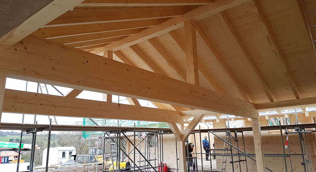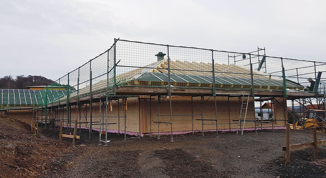 Auch deshalb ist dieses neue Blockhaus besonders großzügig. Die Bauherrschaft wünscht ein eingeschossiges Blockhaus in U-Form und lässt den Rohbau als "Richtmeistermontage" aufbauen. Den Rest organisiert die Bauherrschaft vor Ort selbst. Ihr Blockhaus dient als Ruhesitz am nahegelegenen Jagdrevier des Bauherrn. Sobald der Ruhestand beginnt, wird man vom jetzigen Wohnort in NRW nach Hessen umsiedeln.