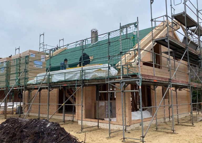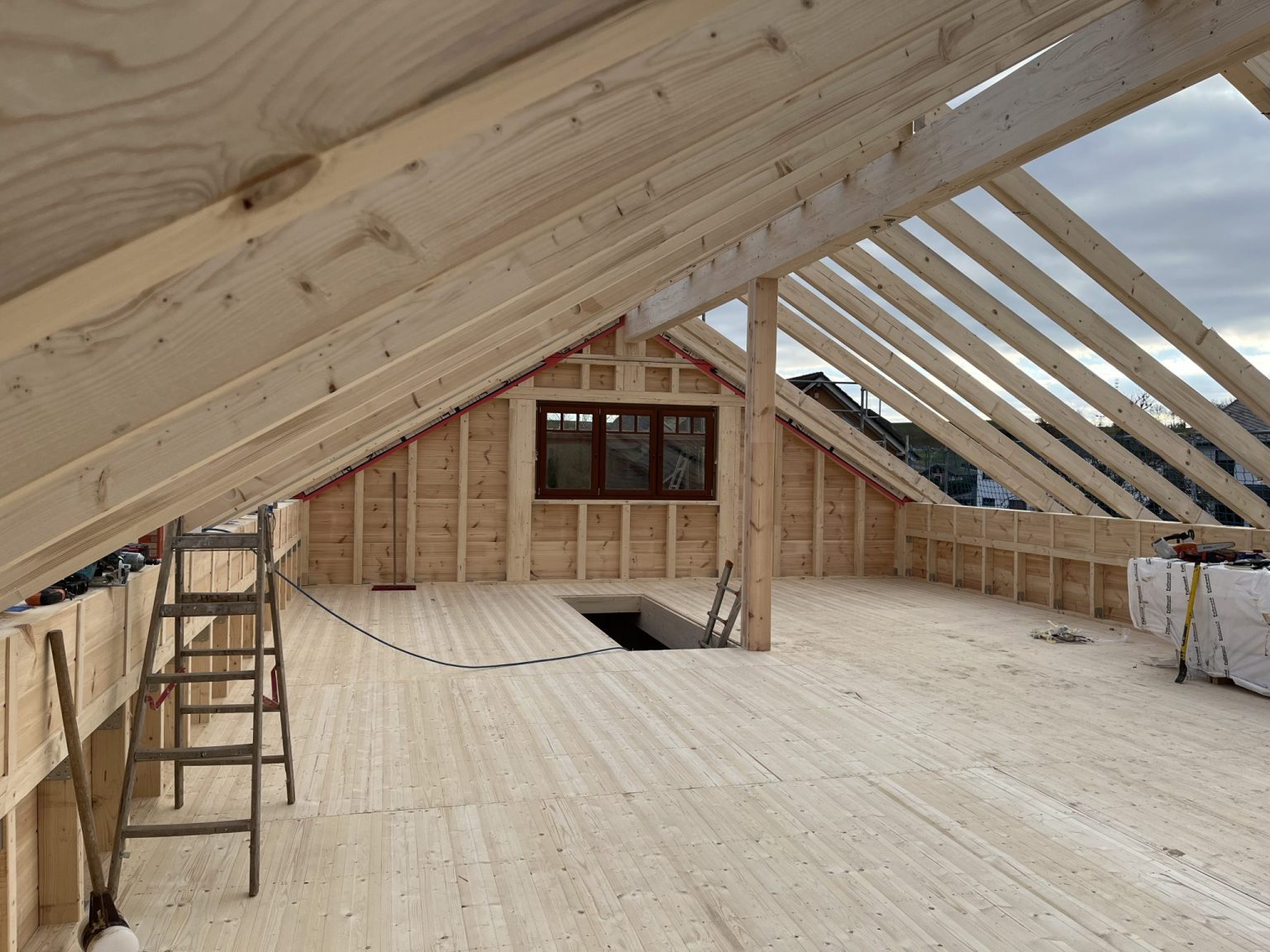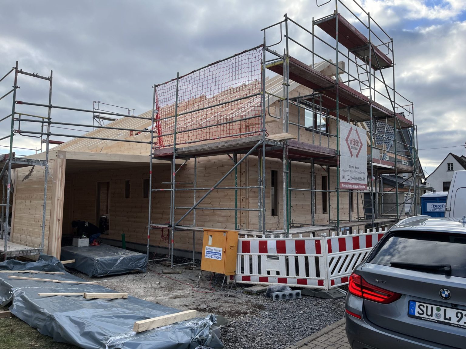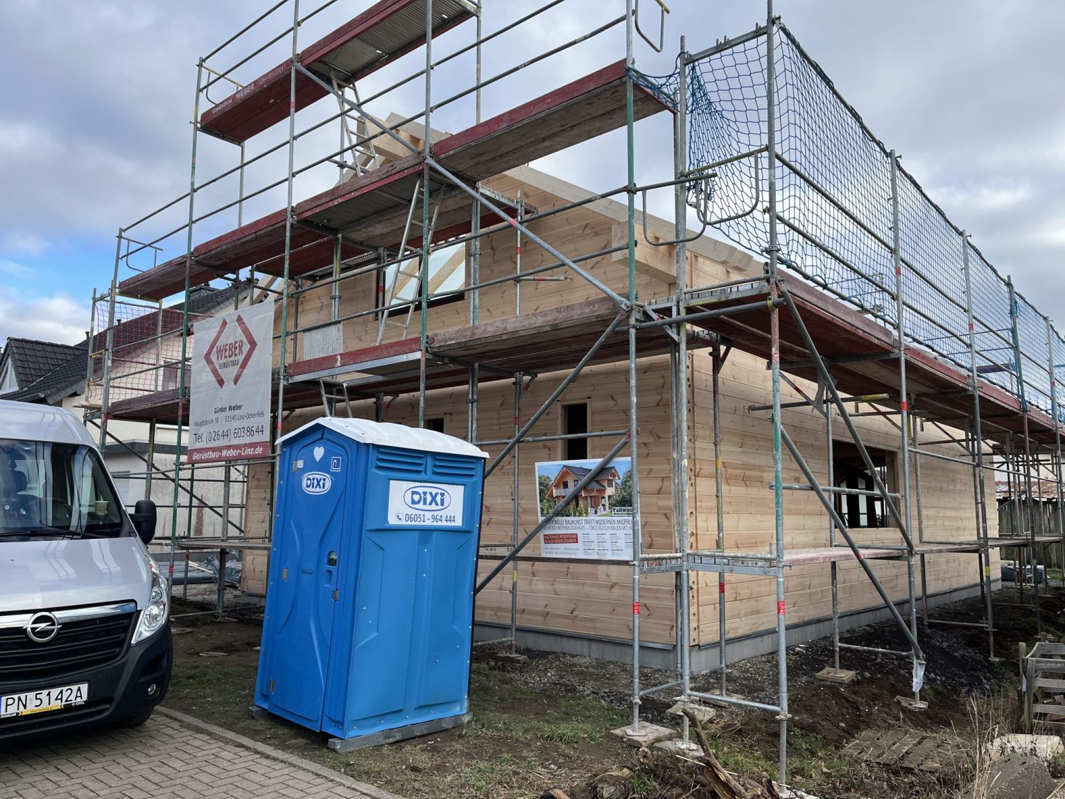 ein pensioniertes Lehrerpaar (Religion und Kunst) baut sein Blockhaus in Vollmontage – ein großes Atelier im Dachgeschoss für ihn, eine Terrassentür mit Segmentbogen für sie. Örtliche Handwerker unterstützen das Vorhaben.