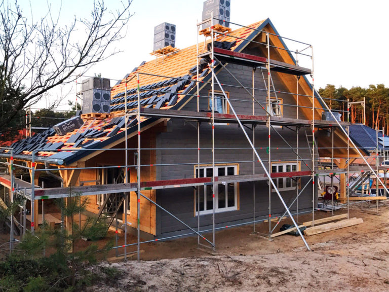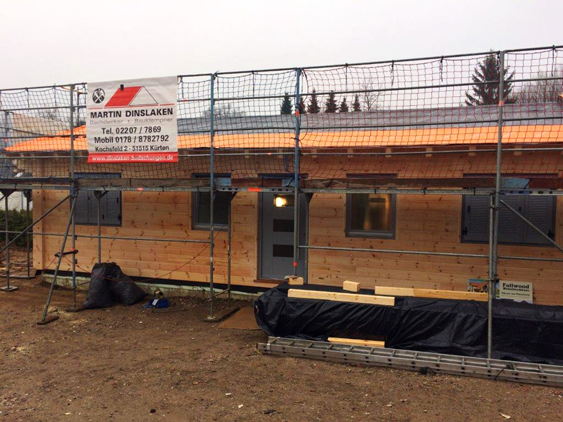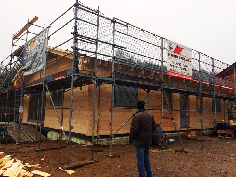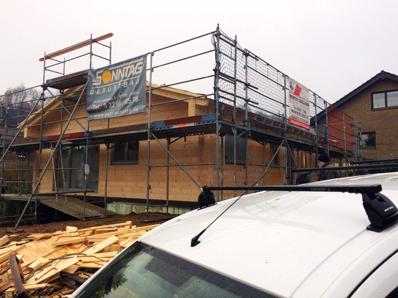 Außerdem wünschen sich die Bauherren bei ihrem Blockhaus bei Köln einen Sichtdachstuhl und die setzungsfreie, einschalige Kiefernblockwand. Wie immer plant Fullwood Wohnblockhaus ein individuelles Blockhaus ganz nach den Wünschen der Bauherrschaft und bereichert die Ideen der Kundschaft mit professionellen Tipps und Tricks. Um ihrem modernen Blockhaus eine Spur Landhausstil zu verleihen, montieren die Bauherren später Klappläden an die Fenster.