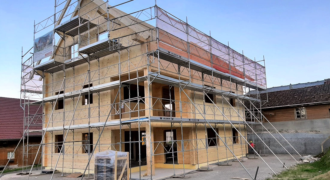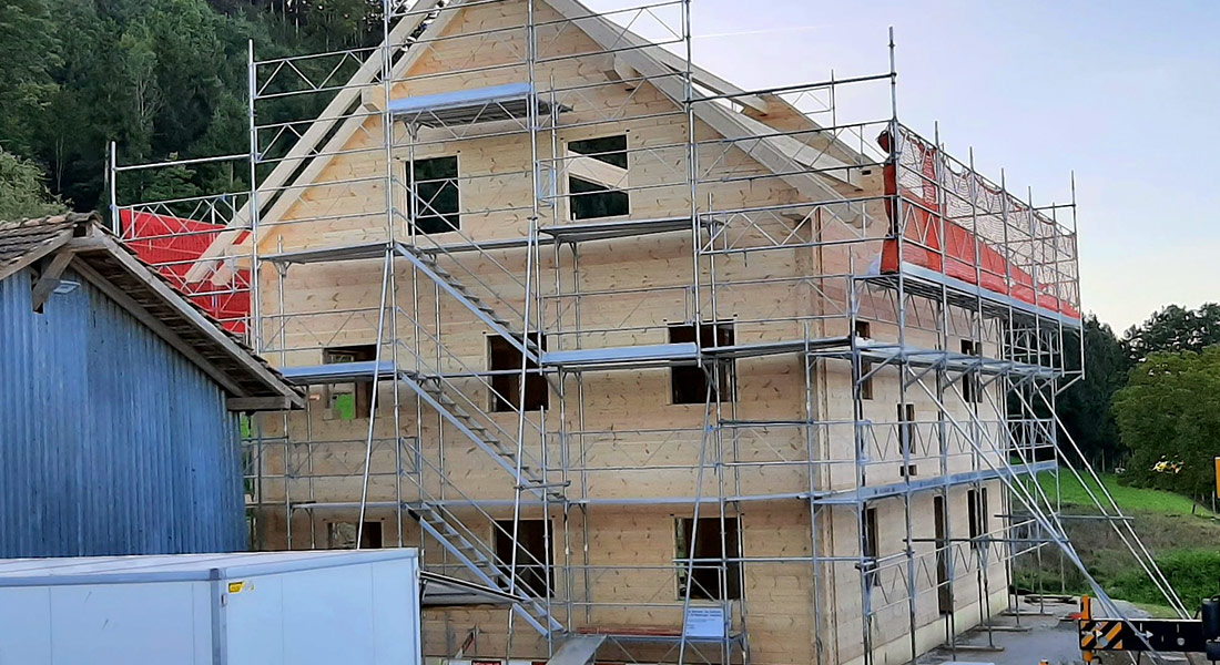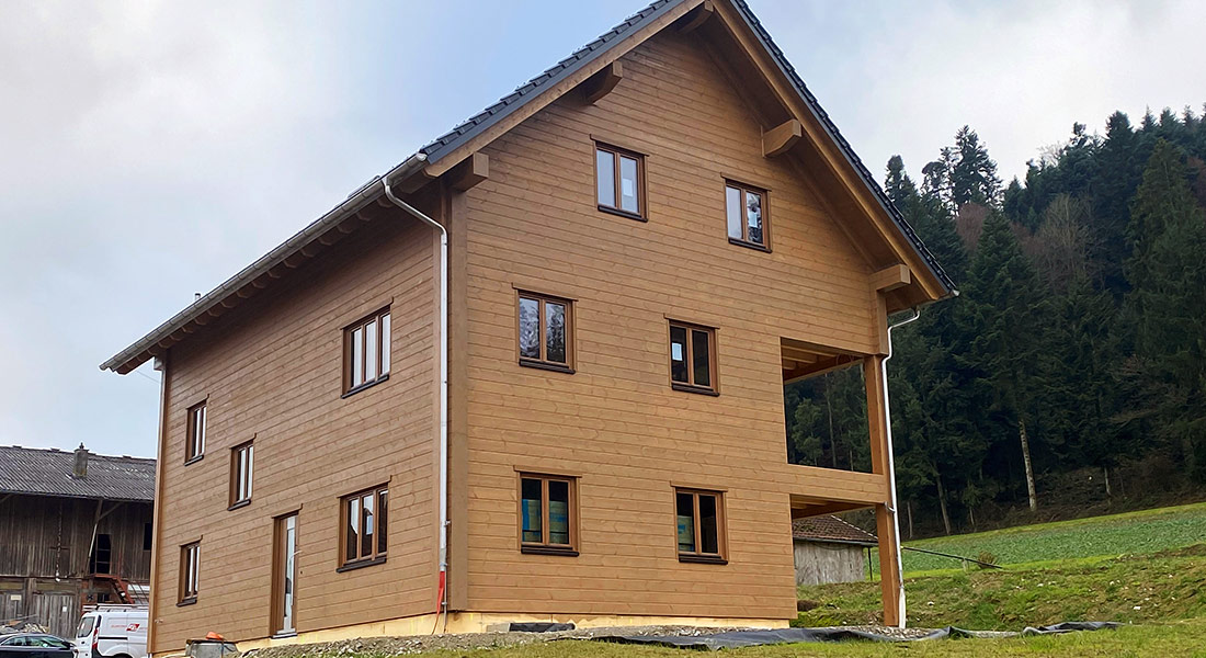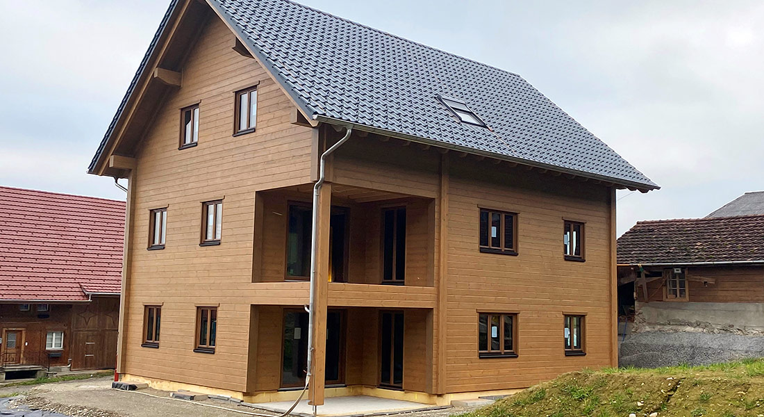 Hier lässt die Bauherrschaft das alte Bauernhaus der Familie der Bauherrin abreißen, um an selber Stelle ein großes Blockhaus mit zwei Wohneinheiten zu errichten. Ihre Landwirtschaft haben die Eltern der Bauherrin aufgegeben und genießen bald ihren Ruhestand im Erdgeschoss des neuen Blockhauses. Das Obergeschoss und Dachgeschoss wird der jüngeren Generation als Familiennest dienen. Den Keller, auf dem das Blockhaus komplett von Fullwood montiert wird, hat die Bauherrschaft im Vorfeld eigenhändig mit Hilfe eines Maurers in der Familie gebaut. Das Zweifamilienhaus wird mit den extra-dicken Blockwänden gebaut, welche Fullwood überwiegend in der Schweiz verbaut. Die gesamte Baufamilie ist überglücklich und sehr stolz, ihr Blockhaus mit Fullwood zu bauen!