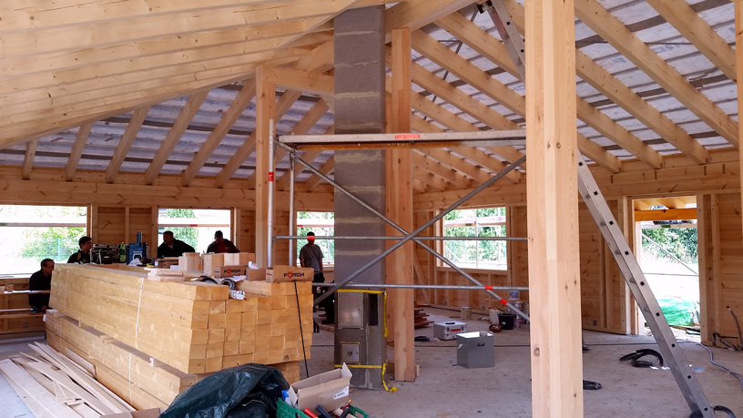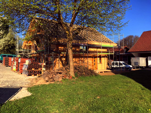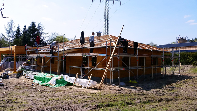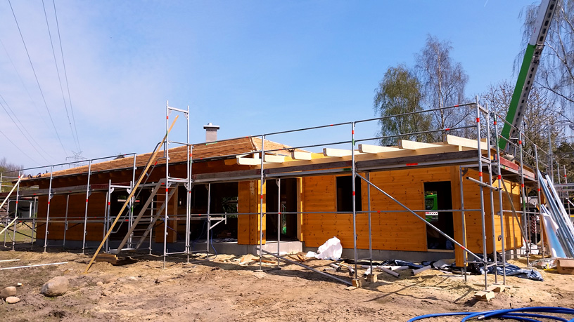 Die Planung des eingeschossigen Blockhauses erfolgt wie immer in enger Zusammenarbeit mit den Bauherren, damit aus deren Traum vom Blockhaus Wirklichkeit wird. Die Bauarbeiten im Hier und Jetzt verlaufen ohne Komplikationen, so dass bisher alles im festgelegten Zeitplan liegt. Da die Bauherrschaft später mit Erdwärme heizen wird, sind die nötigen Vorkehrungen hierfür bereits vor Montagebeginn getroffen worden.