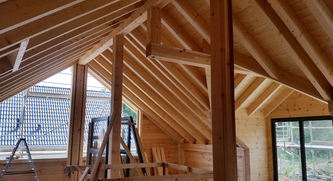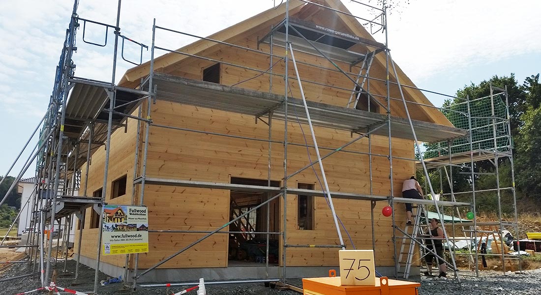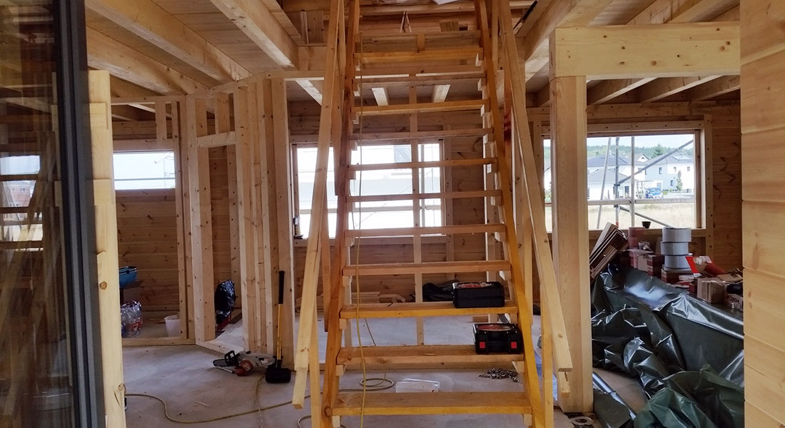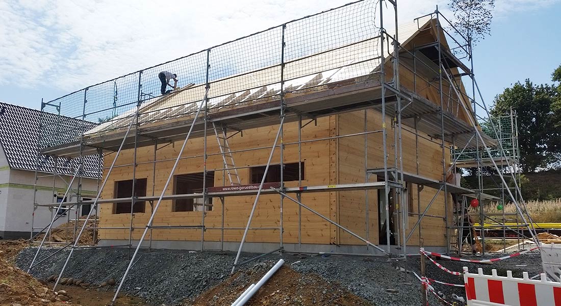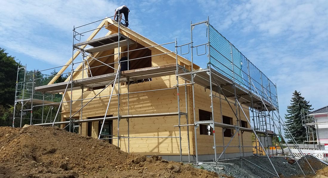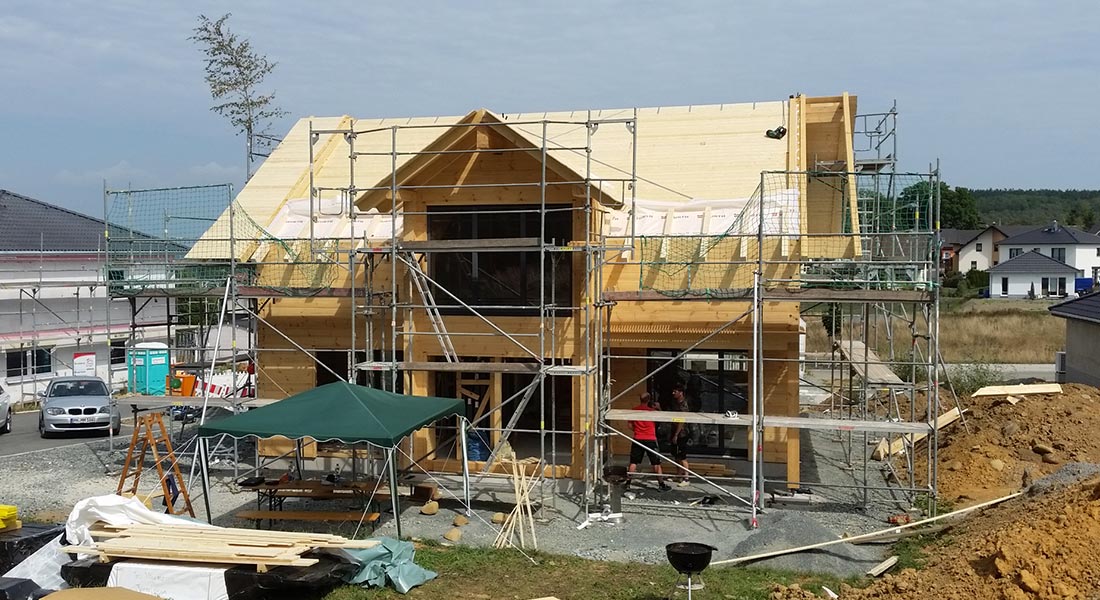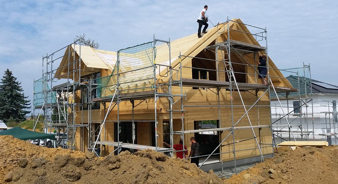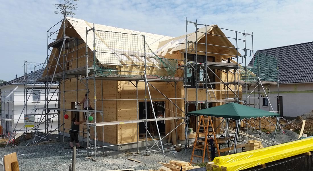 Zum Glück mussten keine sächsischen Bäume für das Blockhaus gefällt werden, da die Wände aus Polarkiefernholz gebaut werden. In diesem Fall wird die Kombiblockwand mit Kerndämmung montiert. Die Bauherrschaft ist mit viel Eigenleistung dabei und freut sich auf das Ende der Bauarbeiten und den Einzug in ihr schönes, wohngesundes Blockhaus.