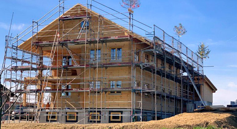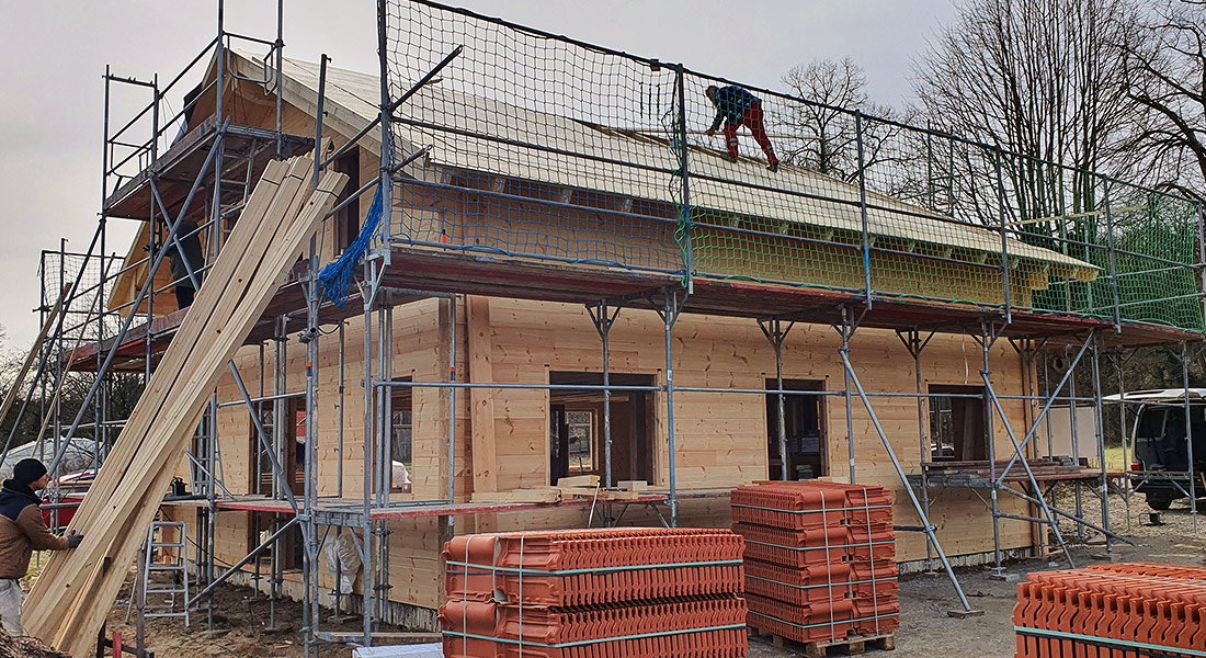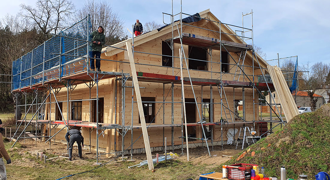 Nicht nur ökologisches Bauen in nachhaltiger Bauweise spielt bei diesem Blockhaus eine große Rolle, sondern auch vedische, energetische Regeln innerhalb von Räumen. Die beiden Bauherrinnen sind begeisterte Anhängerinnen des Yoga und östlicher Philosophie. Sie packen kräftig mit an bei der Montage ihres Neubaus und vergeben die Gewerke des Innenausbaus an örtliche Handwerksbetriebe. Auch hier kann alles im Fluss bleiben. Das Blockhaus geplant hat ein spezialisiertes Architekturbüro (vedischesbauen.de).