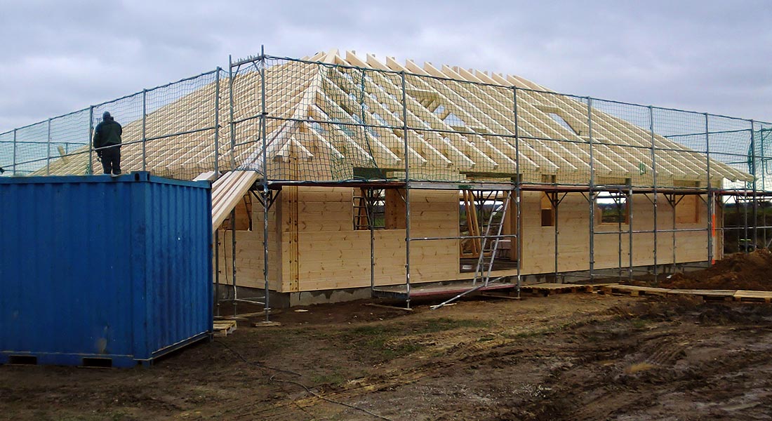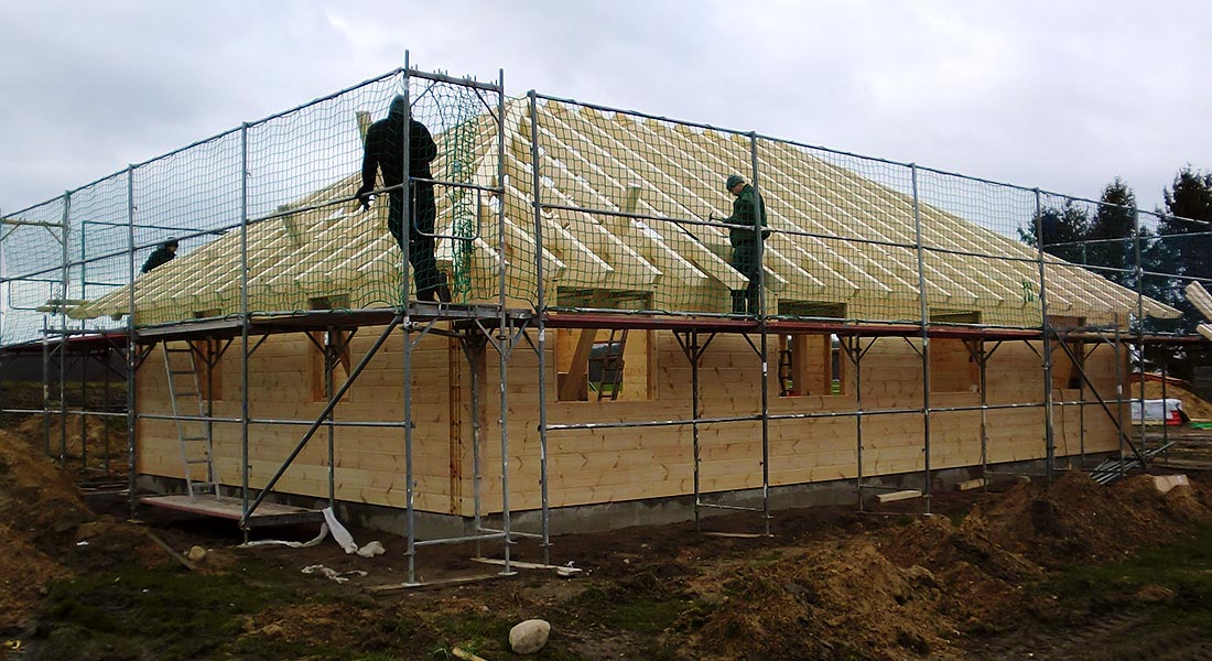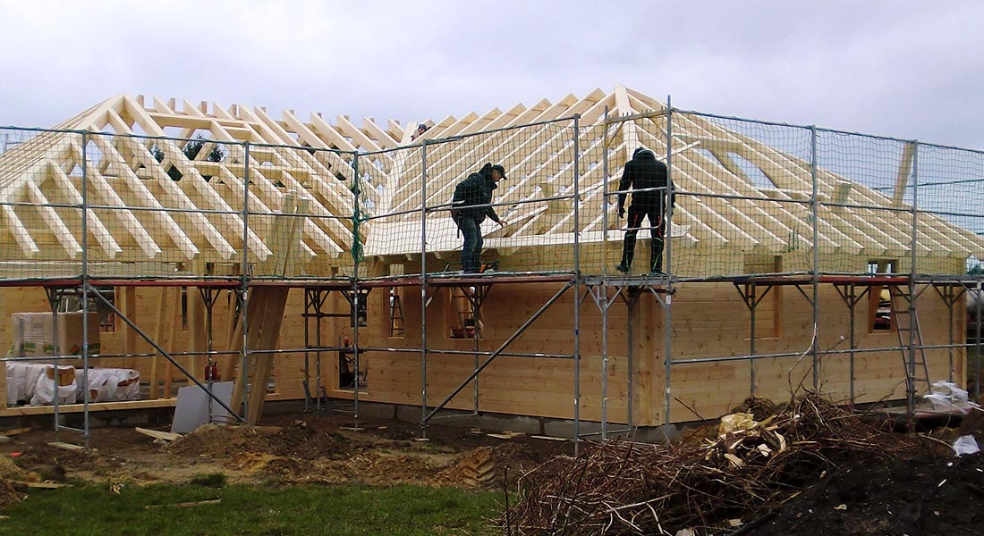 Dank der Dachform besitzt das Blockhaus reichlich Platz zum Abstellen auf dem Dachboden. Die einschaligen, massiven Blockwände werden vom Fullwood-Richtmeister, dem Bauherrn und dessen Profi-Helfern, bestehend aus Tischler und Dachdecker, montiert. Wie immer sind Blockhaus und Dachstuhl fix aufgebaut.