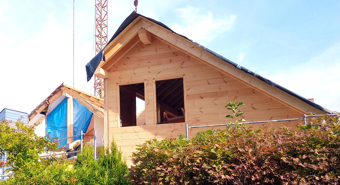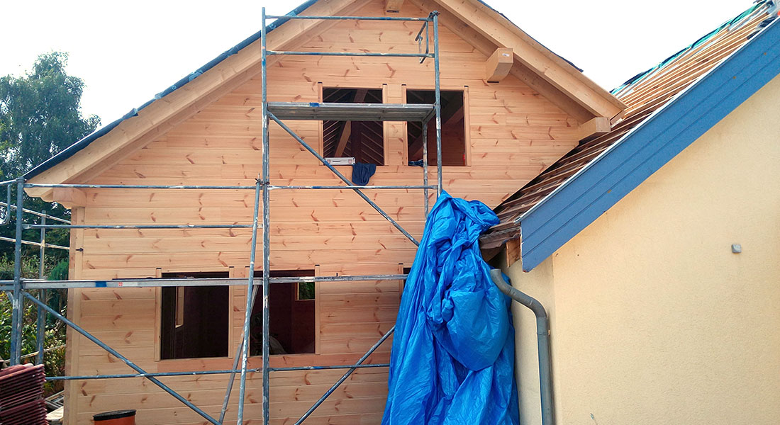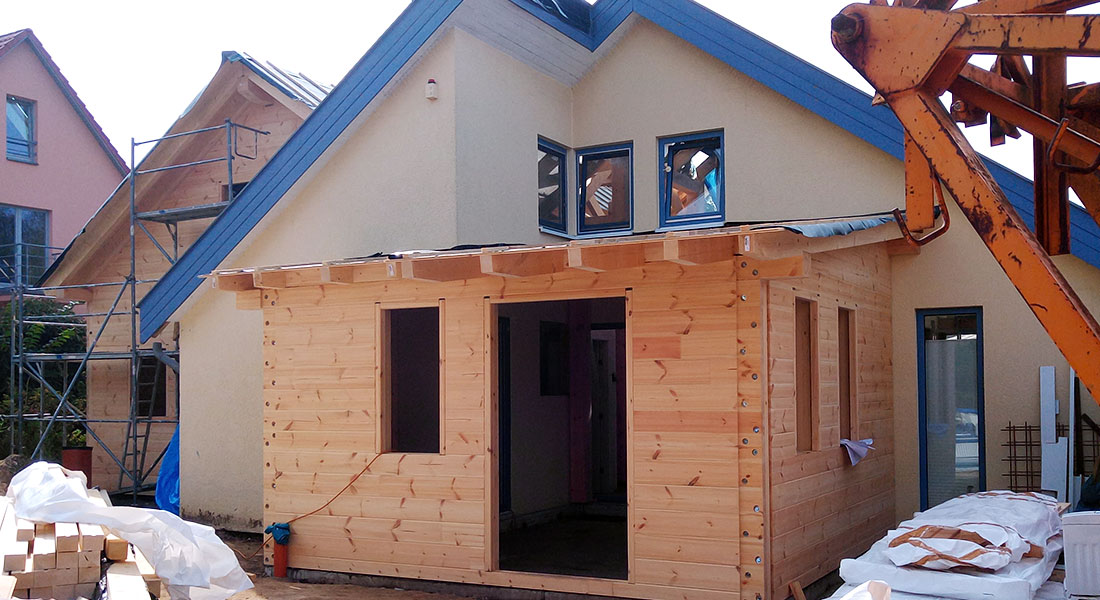 Die Baufamilie besitzt bereits ein Blockhaus in Ständerbauweise, an das sie nun von Fullwood Wohnblockhaus anbauen lässt. Mit der Kombiblockwand entstehen ein anderthalbgeschossiger Anbau, der im Erdgeschoss ein Bad sowie ein Schlafzimmer und im Dachgeschoss ein Gästezimmer und ein Büro beherbergen wird. In einem zweiten, wintergartenartigem Anbau (eingeschossig) wird ein heller Essbereich eingerichtet, auf dessen Flachdach eine Terrasse entsteht. Im dritten Anbau wird ein freundlicher Eingangsbereich verwirklicht. Die teils sehr aufwändigen Anpassungsarbeiten an das bestehende Blockhaus führt der erfahrene Fullwood-Richtmeister komplett mit seinem Team durch. Die Gewerke des Innenausbaus werden zuletzt von örtlichen Handwerksfirmen durchgeführt. Auch der stets positive Bauherr hilft mit, wo er nur kann. Die Bauherrschaft freut sich sehr darauf ihren Lebensmittelpunkt von Lüneburg in ihr neues Blockhaus an der Ostseeküste zu verlegen.