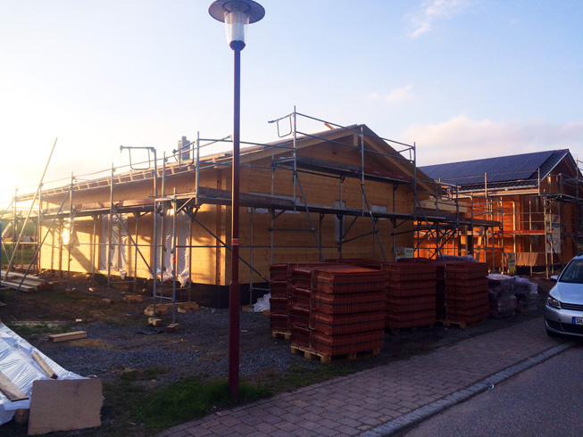 Gleich nebenan steht auch schon ein Blockhaus, ebenfalls von Fullwood Wohnblockhaus, dessen Baubeginn fünf Wochen zuvor startete. Bei dem nun im Ausbau befindlichen neuen eingeschossigen Blockhaus handelt es sich um eine exakte Richtmeistermontage, bei der die 20cm dicken Polarkiefernwände fertig zugeschnitten geliefert wurden und schnell auf dem Baugrundstück montiert werden konnten. Solides Blockhaus in Baden-Württemberg für heute, morgen und die nächsten Jahrhunderte! Wer weiß: Vielleicht kommen noch mehr schöne Blockhäuser von Fullwood hinzu?