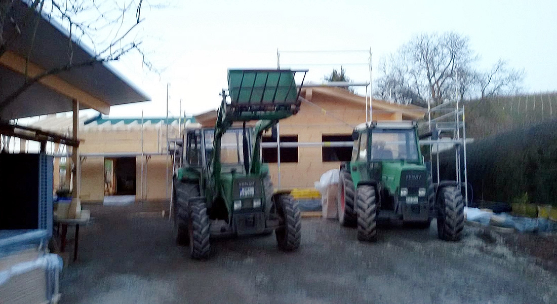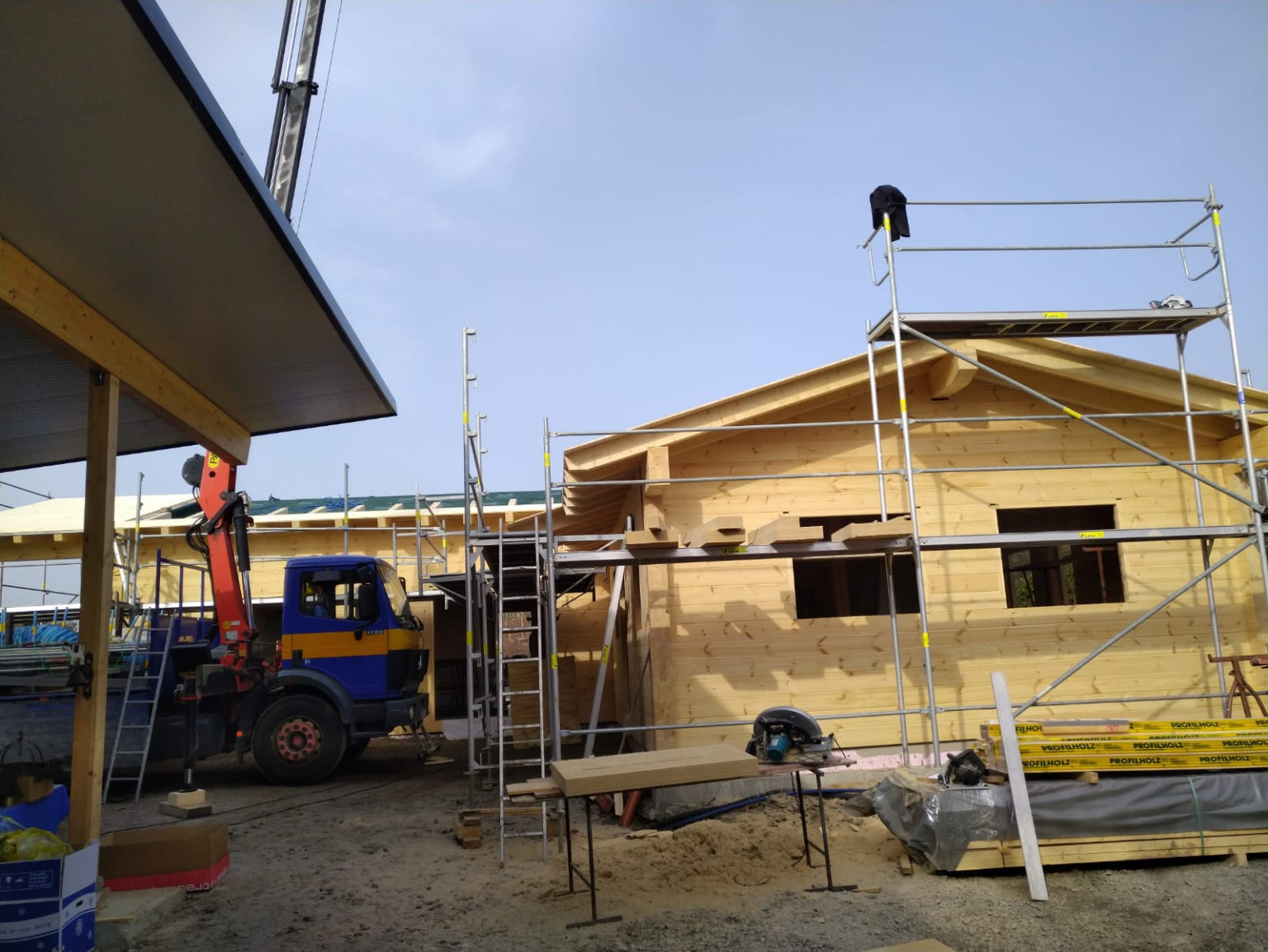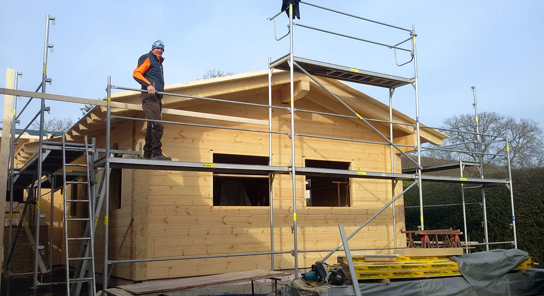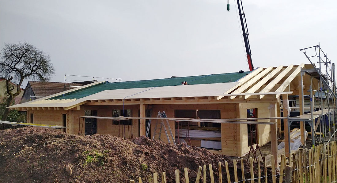 Dieses eingeschossige Blockhaus ist komplett auf einer Ebene, damit die Mutter des Bauherrn in ihrer eignen Einliegerwohnung mobil sein kann. Die Baufamilie hilft bei der Montage der 20cm dicken Massivholzwände mit und wird dabei vom Fullwood-Richtmeister angeleitet. Den Blockhaus Innenausbau organisiert die Bauherrschaft komplett in Eigenregie und macht auch einiges eigenhändig.