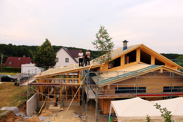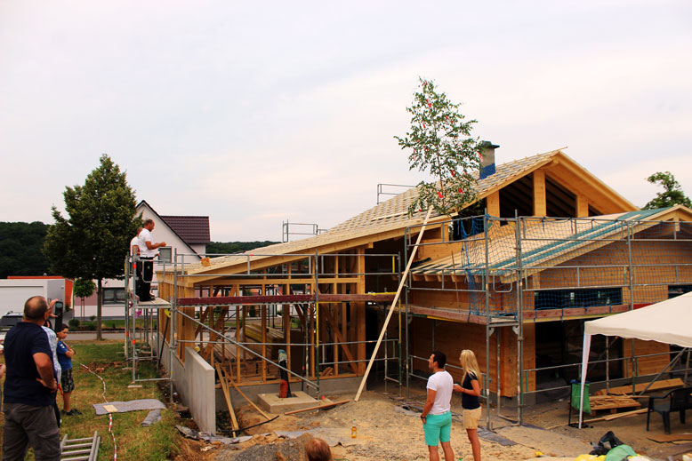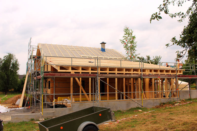 Zur Straßenseite präsentiert sich das Blockhaus mit dem eineinhalb-geschossigen Giebel, während der First an der Gartenseite deutlich niedriger ist und sich auf dem Satteldach des eingeschossigen Gebäudeteils befindet. Ein sehr großer Carport mit viel Stauraum befindet sich unter dem einseitig abgeschleppten Satteldach. Die gesamte Architektur und Planung von diesem neuen Blockhaus in Bayern ist individuell auf die Bauherren abgestimmt. Mittlerweile sind die Bauarbeiten um ein vielfaches weiter gediehen als auf den Fotos zu sehen, und das Blockhaus ist bezugsfertig.